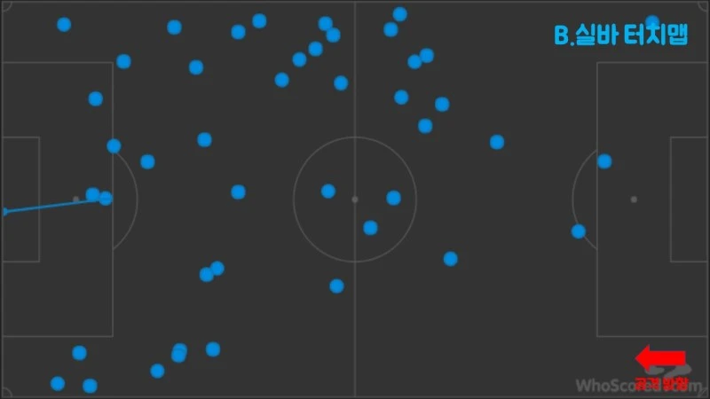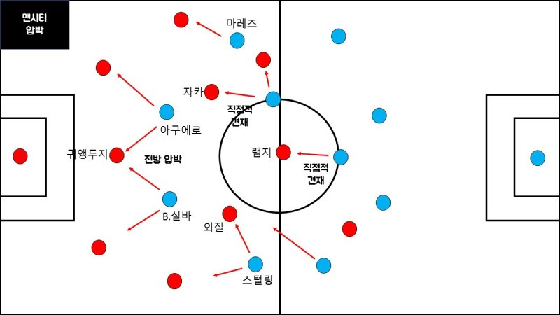 맨시티 압박오늘 맨시티가 보여준 강력한 전방 압박은 아스날의 후방 빌드업을 완전히 무력화시켰다. 맨시티의 최전방에 배치된 아구에로와 B.실바가 1차 압박을 전개했다. 즉 맨시티는 굉장히 높은 위치에서부터 수비를 시작한 것이다. 위에 게시된 터치맵을 통해서도 알 수 있듯이 두 선수는 아스날의 최후방 빌드업을 전개하는 소크라티스-귀앵두지-무스타피에게 균열을 만들어내기 위해 노력했다.