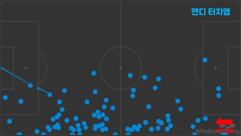 멘디는 공격시 왼쪽 윙백 위치에만 국한되지 않고 맨시티의 후방 빌드업을 책임지는 페르난지뉴를 지원하기 위해 수시로 그와의 간격을 좁혔다. 이는 위에 게시된 멘디의 터치맵을 통해 반증이 가능하다. 이러한 멘디의 전술적 움직임은 지난 시즌 델프가 수행했던 역할과 매우 흡사했다. 이처럼 멘디가 왼쪽 빌드업 단계에 가담한 이유는 맨시티가 왼쪽 미드필더 진영에 마땅한 선수를 배치하지 않았기 때문이다. 물론 멘디가 델프처럼 왼쪽 미드 진영 전체를 홀로 커버한 것은 아니다. 위와 같은 멘디의 움직임은 페르난지뉴의 패스길이 차단되었거나 교체 투입된 데브라위너가 후방 빌드업에 가담했을 때만 제한적으로 이루어졌다.