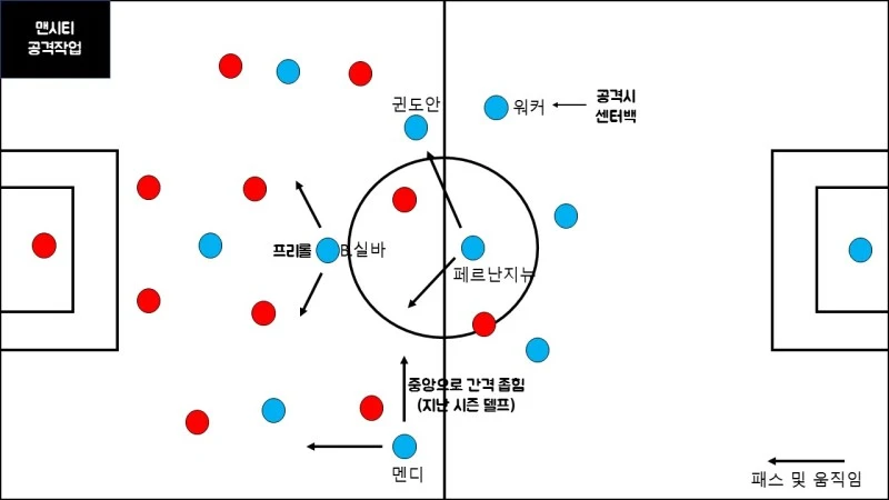 맨시티 공격작업아스날전 맨시티 전술의 핵심은 단연 좌우 윙백이었다. 오늘 왼쪽의 멘디, 오른쪽의 워커는 측면의 지배자라는 수식어가 아깝지 않을 정도의 퍼포먼스를 보여주었다. 멘디는 공격시 윙백/수비시 풀백을, 워커는 공격시 백쓰리의 한축/수비시 풀백 역할을 소화했다. 특히 공격시 두 선수가 수행한 전술적 움직임이 인상적이었다.
