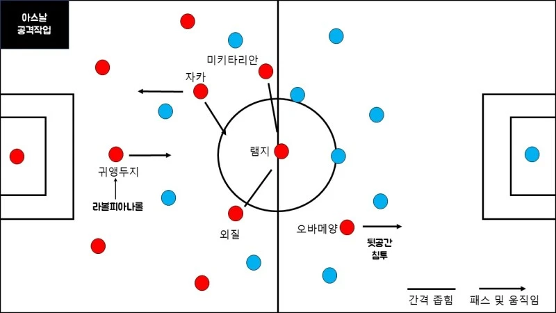 아스날 전방 공격 작업의 키워드는 스위칭이었다. 미키타리안-램지-외질로 이어지는 2선은 위치를 가리지않고 뛰어다니며 맨시티의 압박에 혼선을 주었다. 최전방 공격수로 출전한 오바메양은 2선에서의 숫자 싸움에 힘을 보태기도 했지만 주로 빠른 스피드를 바탕으로 맨시티 수비의 뒷공간을 허무는데 주력했다. 위 아스날 선수 위치도를 통해 알 수 있듯이 미키타리안-램지-외질-오바메양은 서로의 위치에 국한되지 않고 자유로운 움직임을 구사했다.