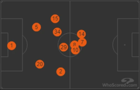 위와 같은 맨시티의 강력한 압박으로 인해 아스날은 무려 21개의 턴오버를 범했다(맨시티12개). 특히 맨시티의 주된 압박의 대상이 된 구앵두지와 외질은 각각 6개, 5개의 턴오버를 범하며 매우 어려운 경기를 치러야 했다.