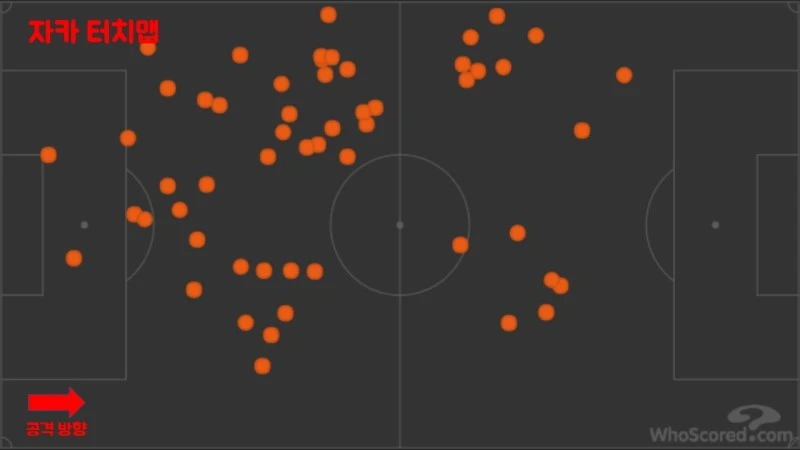 상술했듯이 아스날은 후방 빌드업시 소크라티스-귀앵두지(자카)-무스타피로 구성된 라볼피아나 대형을 형성했다. 즉 빌드업이 왼쪽에서 이루어지면 귀앵두지가, 오른쪽에서 전개되면 자카가 라볼피아나롤을 수행한 것이다. 하지만 위와 같은 라볼피아나롤을 더 직접적으로 수행한 선수는 박스 투 박스 움직임을 가져간 귀앵두지였다.