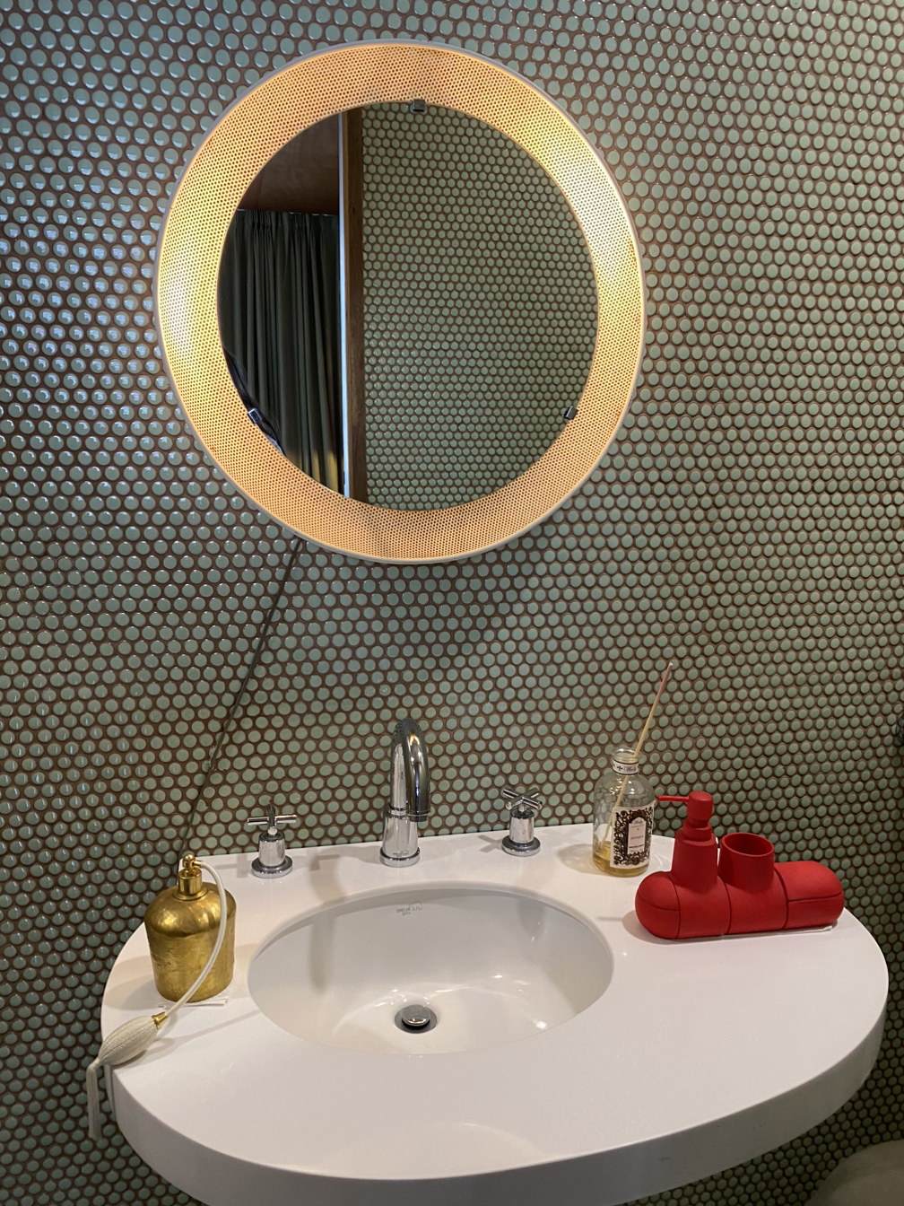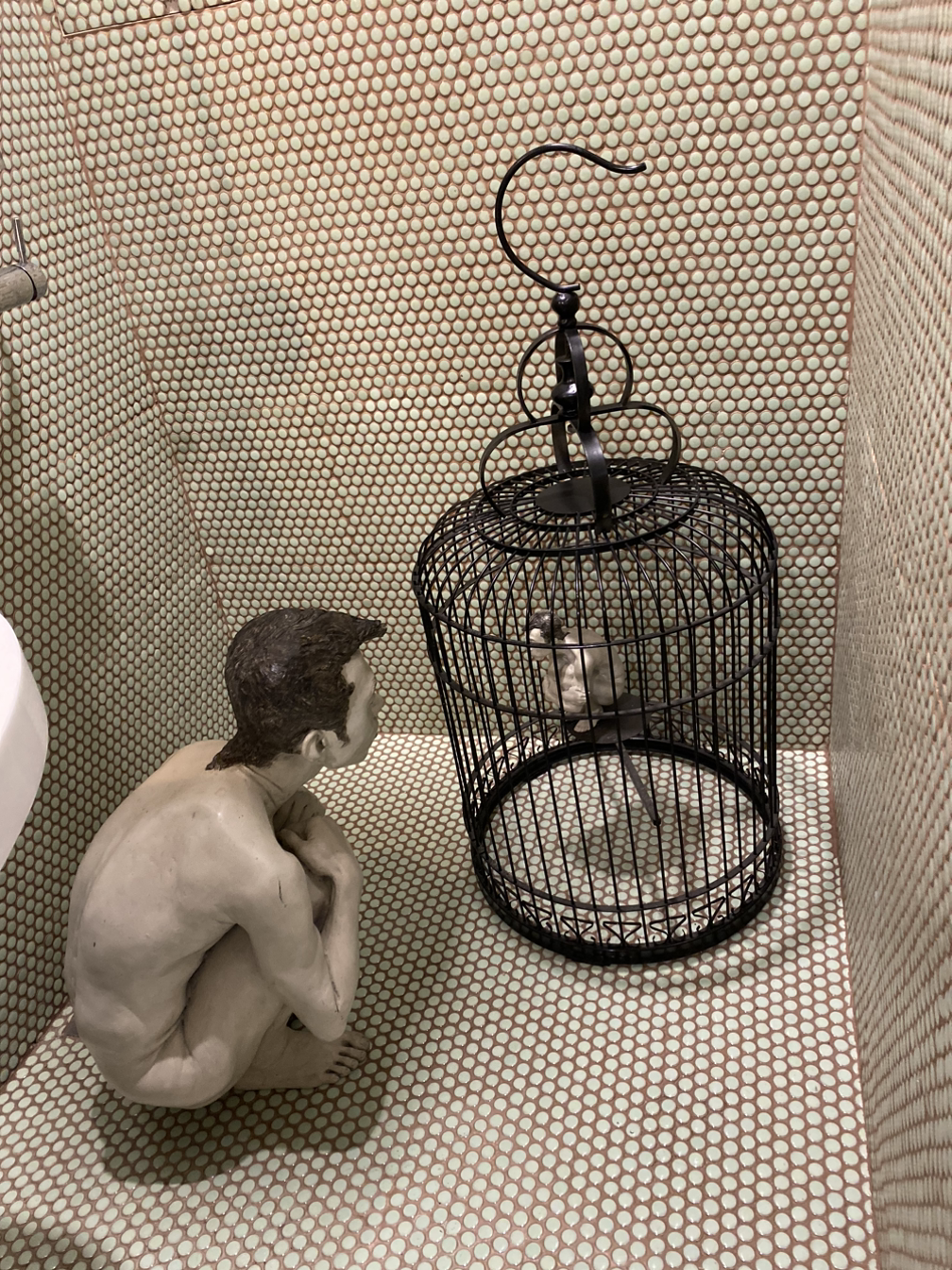 화장실 세면대 아래에 새장에 갇힌 나 자신을 바라보는 동상.