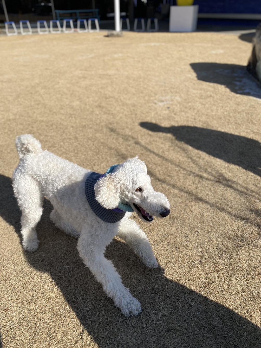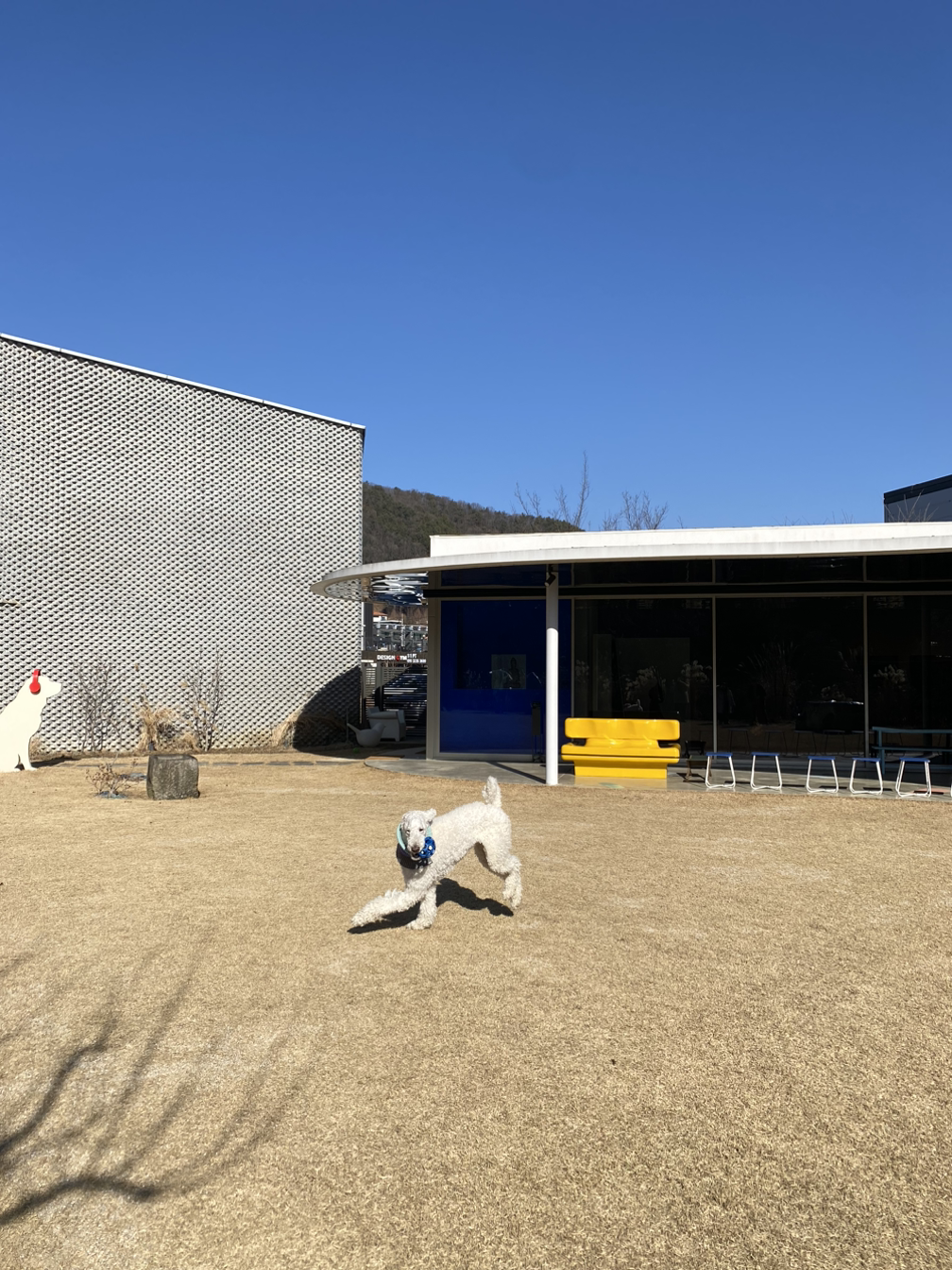 다시 오고 싶은 편안함을 느끼게 하는 '구하우스 미술관'의 마스코트가 있다. 바로 스탠더드 푸들'융'이다. 이 아이는 웬만한 꼬마 아이보다 영리하고 지혜로웠는데 우리를 야외로 인도하더니 자기의 장난감 고무공으로 실컷 놀게 만드는 분위기를 만들어 융에게 푹 빠지게 만들었다. 그리고는 발걸음을 옮기는 우리 몸을 휘감아 가던 길 방향을 돌리고 가지 못하게 해서 몇 번을 더 놀게 만든다. 두 번 정도 질척였을 때 우리가 더 이상 안된다고 하니 바로 쿨하게 실내로 우리를 인도하는 융. "뭐야? 너 사람이야?"