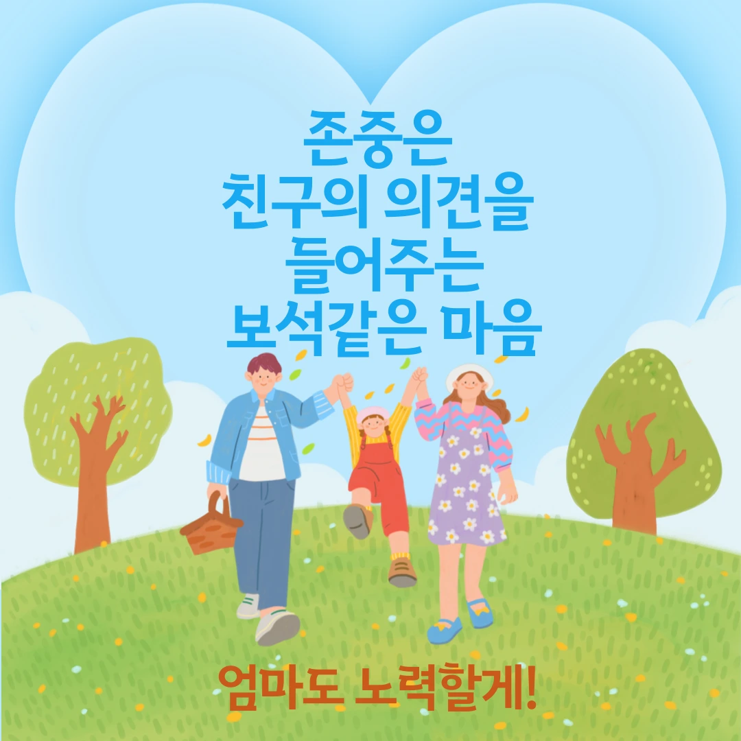 “엄마! 존중은 ‘친구의 의견을 들어주는 보석 같은 마음‘이야. 나는 놀이터에서 놀고 싶은데 친구는 집에서 놀고 싶다고 하는 거야. 그때 무조건 내 의견을 주장하기보다 친구의 의견에 대해 좋은 점을 생각해 보는 거야. 밖은 춥고 집에서는 그림도 그리고 놀 수 있는 방법이 많으니까 친구의 의견을 존중해서 집에서 노는 것도 좋겠다!라고 내 생각을 친구에게 맞춰 볼 수 있는 것 아닐까? ”