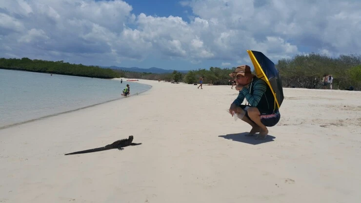 투명한 코발트 빛 바다를 건너가면 작은 맹그로브숲을 품은 아담한 바다가 나타난다. 바위가 방파제가 되어 파도도 없고 수심이 낮아서 안전한 스노클링 포인트. 우리 같은 노약자(?)와 어린이들에게 천국 같은 곳이다. 그리고 물속엔 무려 상어 떼가 있다. 아기 상어 떼. 게다가 더위에 지친 이구아나도 들어와 헤엄을 친다. 허리정도 오는 물속에서 형형색색의 꼬마 열대어와 아기상어와 이구아나들과 어울렸다. 여기가 꿈에 그리던 갈라파고스다. 맹그로브 그늘은 온통 이구아나 차지다. 염치 불고하고 이구아나들 사이에 끼어 누워 깜박 졸았다. 화가 난 그중 한 놈이 침을 뱉었지만 그늘 이라곤 여기밖에 없으니 신세 좀 지겠노라 굽신거렸다. 하늘과 구름까지 예뻤던 또르투가베이가 벌써 그립다. 갈라파고스는 물속 천국 이라더니 꼭 깊은 물속 스노클링 투어를 나가지 않더라도 부근 바닷가에서 놀 거리도 충분한 것 같았다. 돌아올 때는 수상택시를 타고 돌아 오려다 눈에 띄지 않아 그냥 또 걸었다. 더웠지만 상쾌했다.