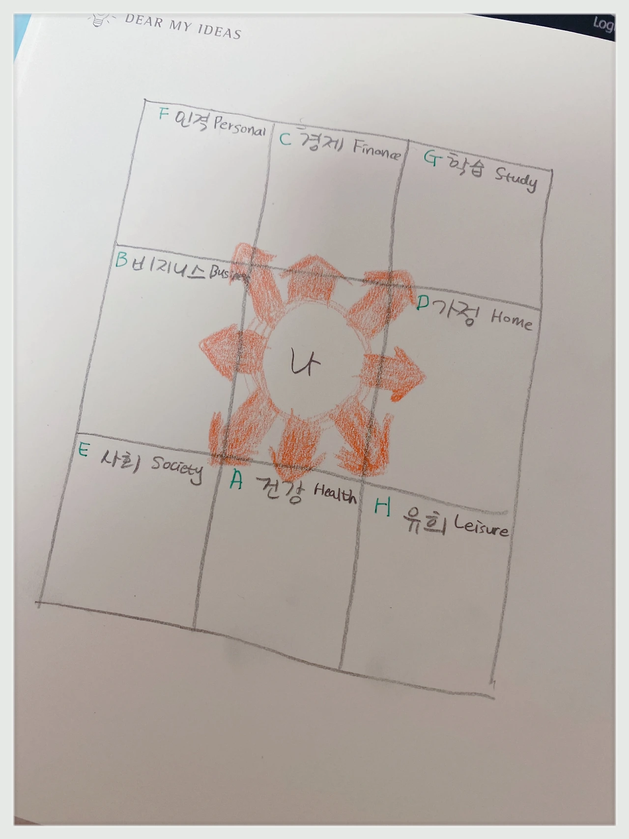 마츠므라 야스오의 <만다라차트 실천법>이라는 책에서 나오는 8칸을 적으며 생각해 보기로 한다. 각 영역에 대해 자기 자신이 설계한다. 건강, 비즈니스, 경제, 사정, 사회, 인격, 학습, 유희라는 8가지 영역이 서로 협력하고 성장하며 발전하는 데 상호보완적으로 역할을 할 수 있도록 말이다.