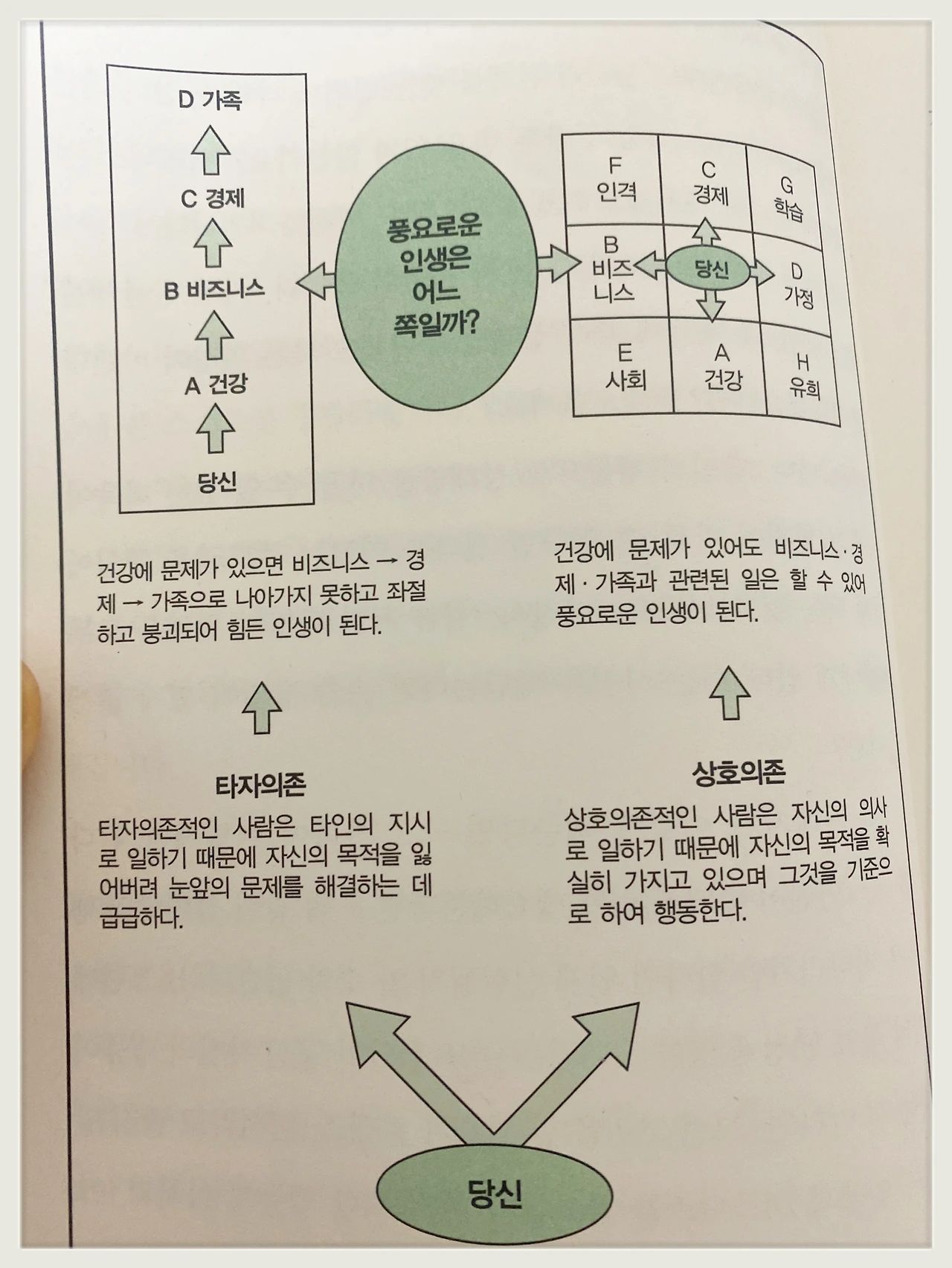 인간관계에서도 마찬가지이니까. 상대의 영향을 받기만 하는(타자의존) 관계나 상대방을 이용하기만 하는 (자기의존) 관계가 아닌, 당신과 상대가 서로 선한 영향을 주고받는 상호의존의 관계를 구축해 나갈 때 건강하고 풍요로운 삶을 살아갈 수 있다는 마츠므라의 주장에 전적으로 동의하는 바이다.