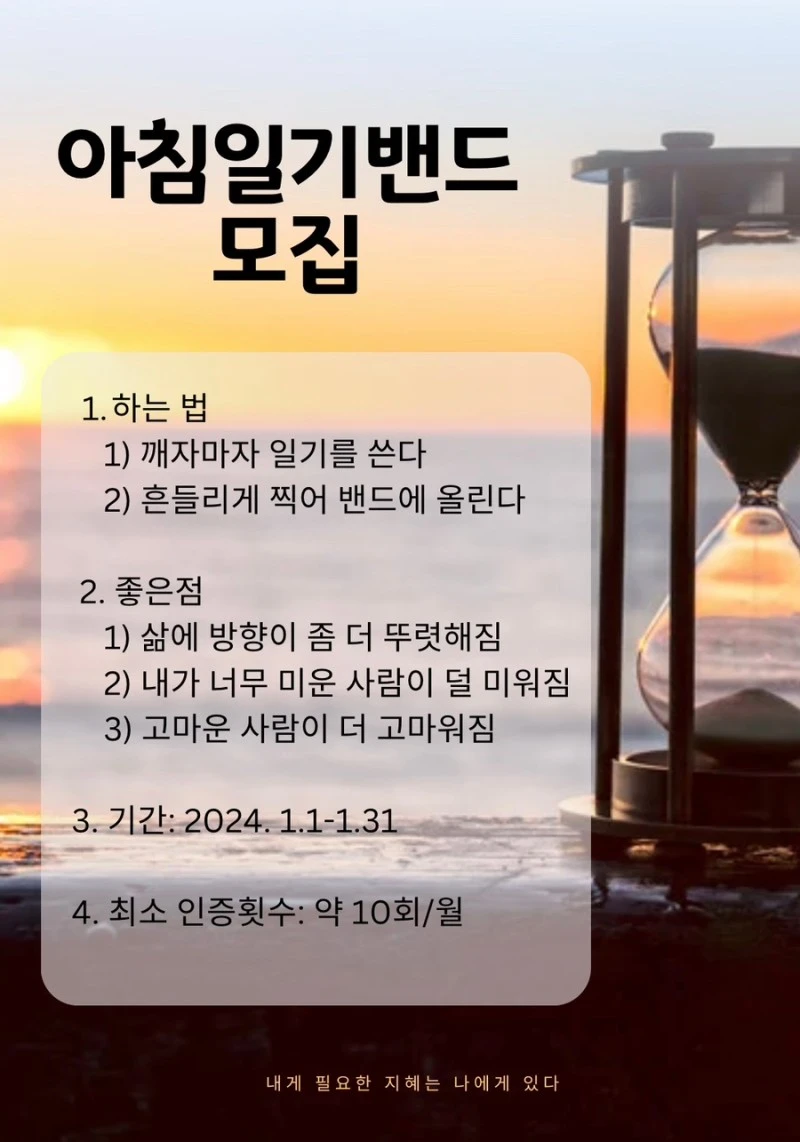 아침일기 밴드 멤버를 충원하기 위해 아침부터 손가락을 움직여 포스터를 만들었다. 언제부터 내가 썼나 확인해 보니 작년 6월부터였다. 22년 6월부터 거의 매일 썼다. 못해도 월 20일은 넘게 썼다.