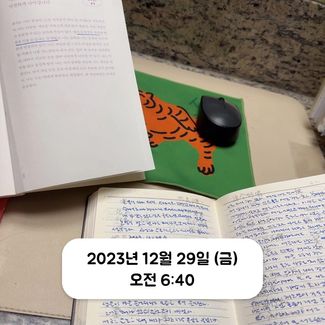 그리고도 뭔가를 더 쓰고 싶다면 자신이 미리 만든 어둔 긍정확언을 쓴다. 나는 20개 정도를 적어두었는데 매일 다 적기 힘들면 그날 끌리는 것을 2-3개 추려도 좋다. 그리고도 더 쓰고 싶다면 하루 한 장 마음 챙김을 한 페이지씩 쓴다. 책의 구성이 365일 하루 한 장씩 긍정의 기운을 북돋아주는 짧은 글로 되어 있다. 물론 시간이 여의치 않으면 제목만 써도 좋다. 뭐든 자기가 할 만큼만 하면 된다. 중요한 것은 깨자마자 하는 것이다.