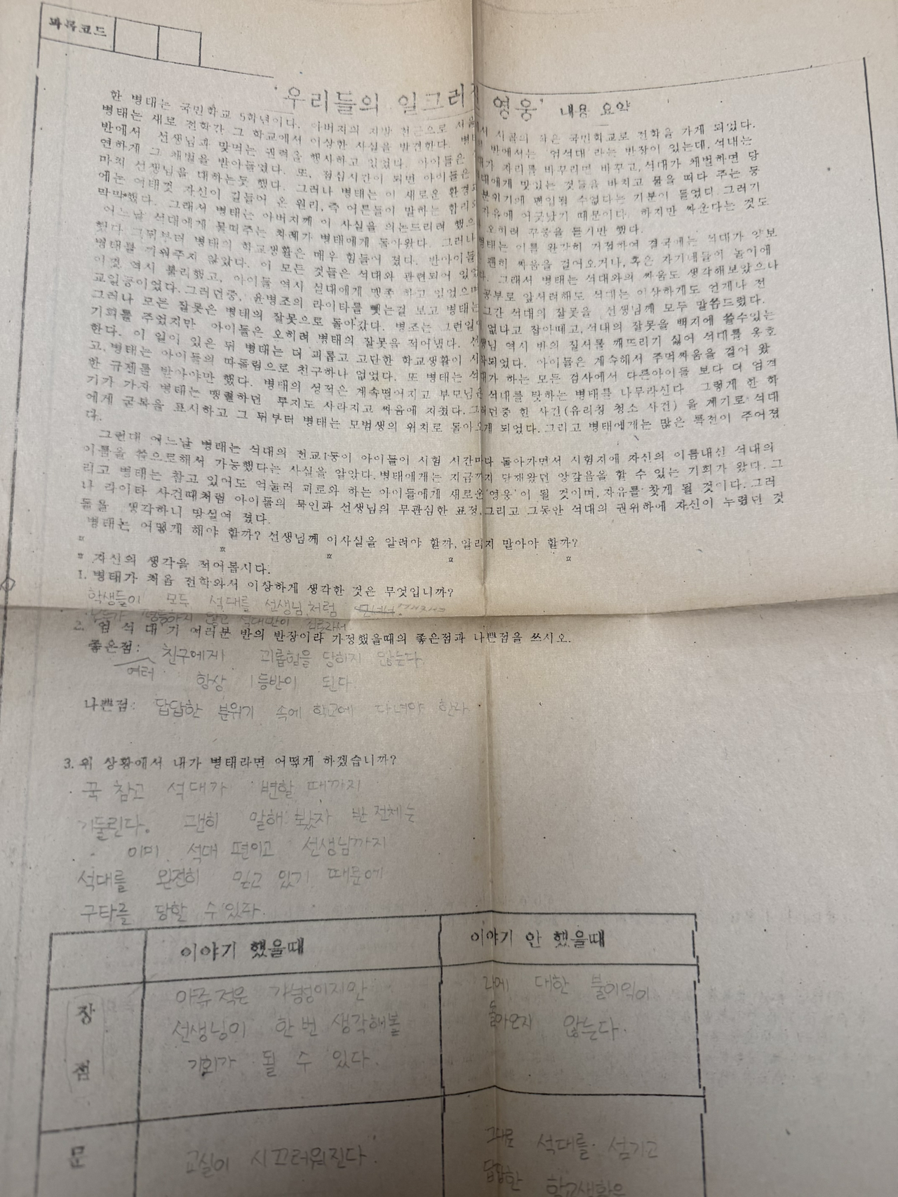 초임샘들이 그렇듯 열정이 많고 새로운 시도를 많이 하셨다. 바로 이 점 때문에 내가 오래도록 샘을 기억하고 있다. 우리들의 일그러진 영웅이니 전태일 이야기, 인종 문제, 부모가 일하러 나간 사이 아이들만 집에 있다가 화재로 숨진 사건 등 그런 보조자료를 나눠주셨다. 한 번 언급에도 놀라기도 하고 그런 일이 있구나 정도로 스쳐갔지만 나중에 두고두고 기억에 남기도 했다. 협동학습, 프로젝트 수업이라는 말도 몰랐던 시절 모둠별로 모아 환경 문제에 관해 뭔가를 조사하는 활동도 했었다. (우리 모둠 내에선 그 과정이 엉망진창이긴 했지만 어찌 됐던 그런 경험 자체로 의미 있었다고 본다.)