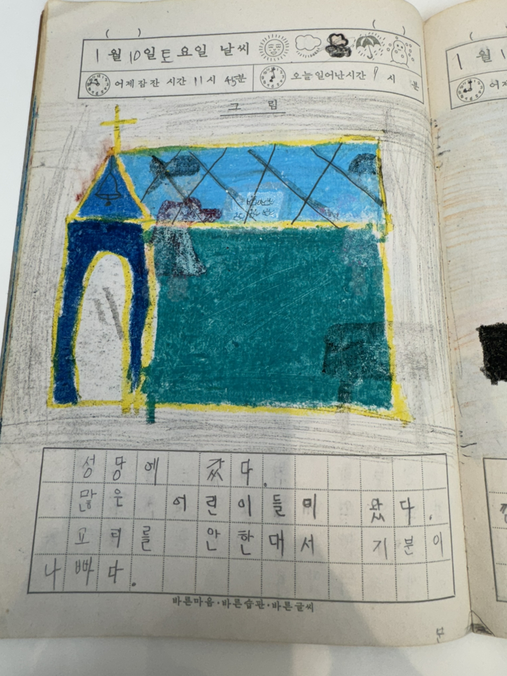 사교육이라고는 모르도 살던 때, 토요일에 가는 성당은 나에게 있어 매우 큰 의미였다. 성당은 대학생 선생님들이 노래도 하고 얘기도 해 주는 일종의 교육, 엔터테인먼트, 보육, (어쩌면 효도?) 그리고 아주아주 약간의 사교기관이었다. 성당을 성실히 다녔던 건 성당 가는 것을 삶의 제1원칙으로 삼으셨던 엄마의 영향이었다. 한창 어린이가 넘쳐나던 시절이라 미사 시간에 성당은 어린이들로 꽉 찼다. (일기는 교리 방학이라 교리가 없었던 모양이다. 재밌지도 않았을 그 시간마저 아쉬워한 과거의 나)