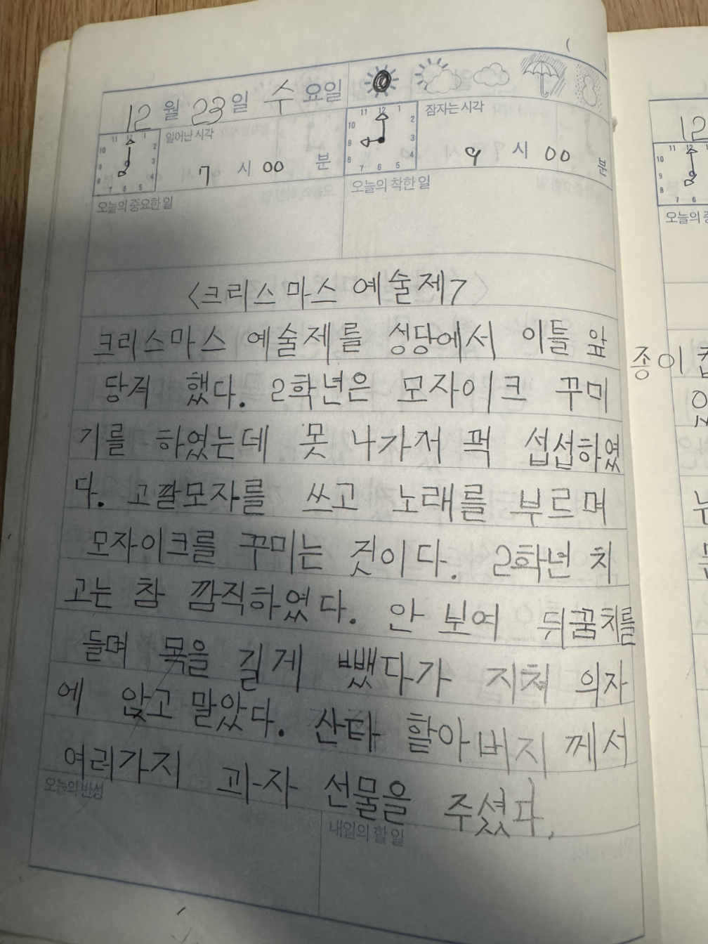 아이들이 많았던 시절의 성당의 크리스마스는 그 준비부터 대단했다. 나의 유년기 내내 성당을 아주 성실히 다녔는데 대림절이라 부르는 크리스마스 약 한 달 전부터 부지런히 뭔가를 준비했다. 2학년의 예술제는 임팩트가 그다지 없었던지 기억이 잘 나지 않는다. 아마도 다 같이 무대 앞에 나가서 모자이크 꾸미기였다가 급히 변경하여 일부 아이들만 나간 게 아닐까 싶다.