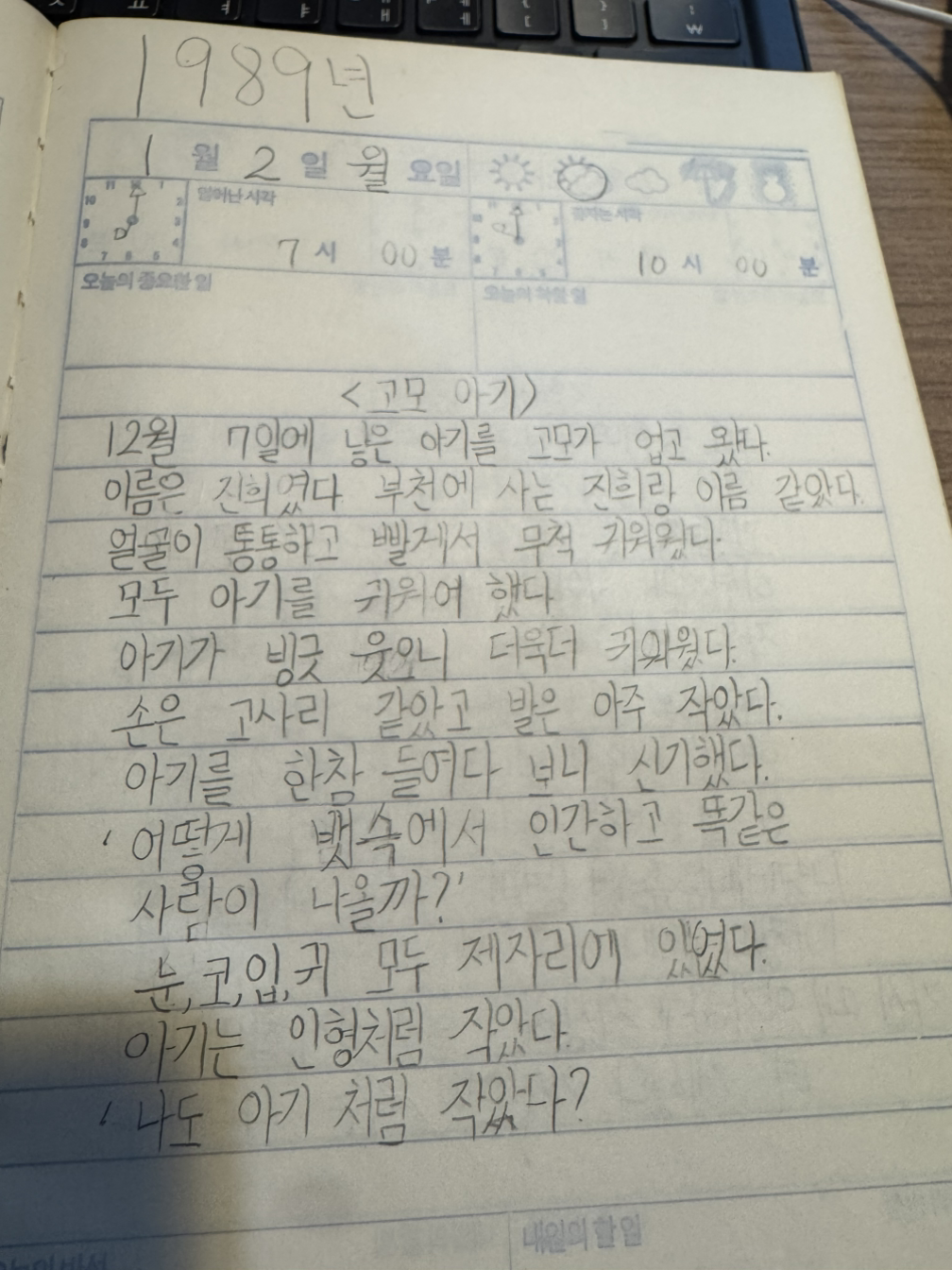 아! 나의 일기로 돌아와서 3학년 겨울방학 일기를 읽는데 이 시기에 나의 초자아가 비대해졌는지 내용이 너무 교훈적이거나 너무 꾸며대서 오글거렸다. 필체마저 정자처럼 굴려 쓴 걸 보면 어떤 변화가 있었던 모양이다. 담임선생님이 무섭고 규율이 엄격해서 짜인 대로 사느라 그랬는지도 모르겠다. 짜야지면 짜인 대로 더 열심히 맞춰가며 살며 선생님이 한 번씩 내려주는 칭찬에 만족해하며 살던 때였다.