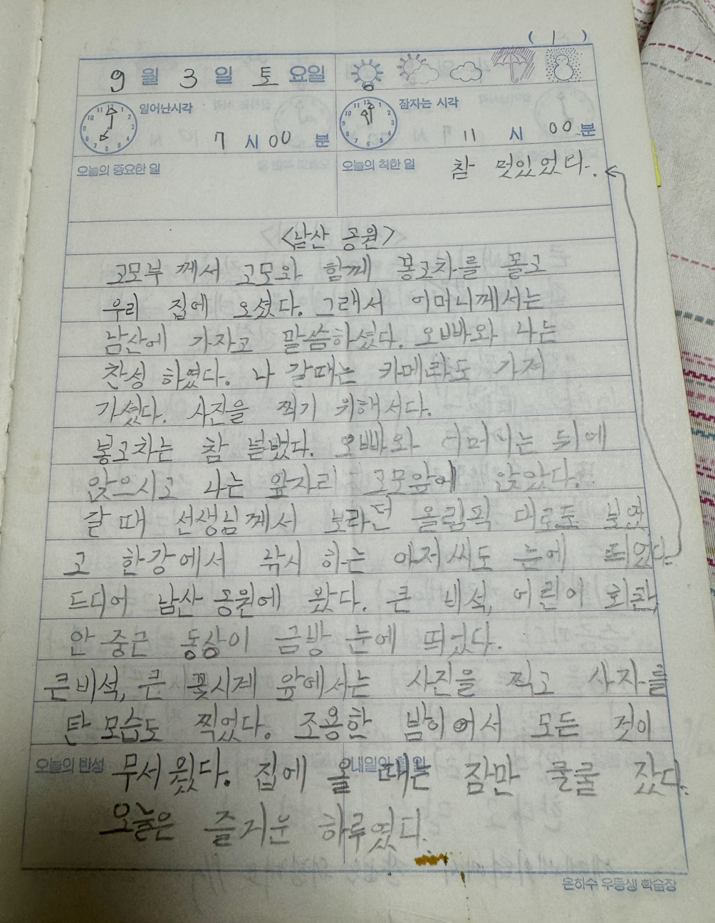 동네를 넘어서는 어디든 간 적이 없었는데 고모부 봉고차 덕분에 이 날 밤에 남산에 간 모양이다. 우리집에 같이 살던 막내시누이와 놀러 온 셋째 시누이 내외 모두 저녁밥을 차려내고 대충 치우고 엄마는 이런 밤나들이가 작은 기분전환이 되었을 것이다. 나 역시 그랬다. 올림픽대로, 한강, 밤의 남산. 이런 단어들이 일기장에 등장한 것 자체가 지금 나에게도 놀랍다. 고모, 고모부의 왕래가 잦아 봉고차 타고 나들이 갔던 때를 빼고는 우리 가족은 다시 여가 침체기에 들어갔기 때문이다.