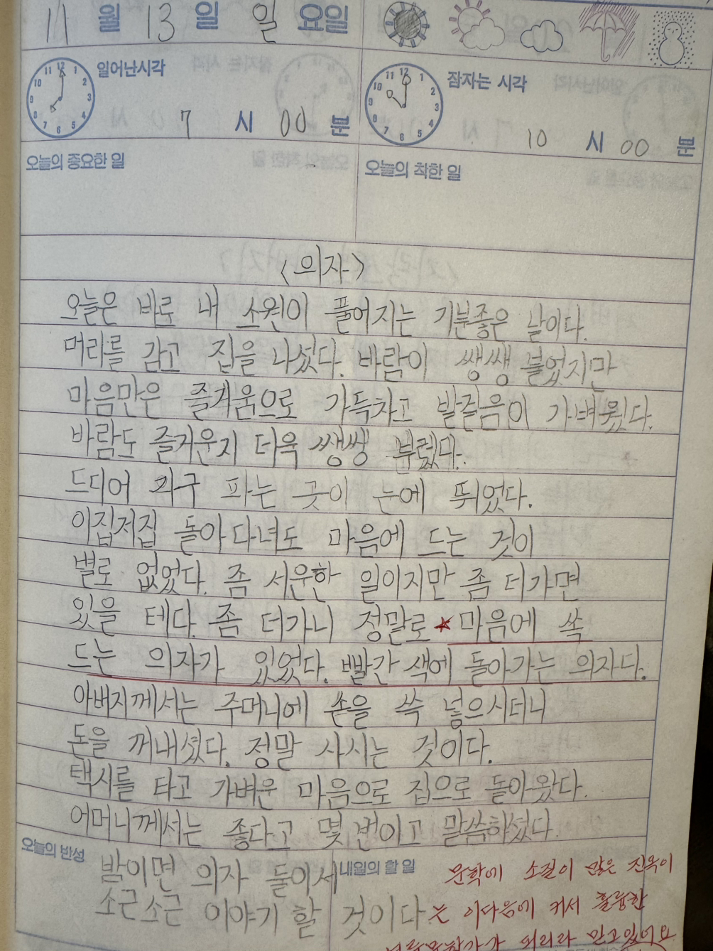 이 날은 확실히 기억이 난다. 당시에 내가 쓰던 책상은 내 나이보다도 많았다. 엄마가 오빠를 임신해 있을 때 아버지가 미래의 아이를 위해 책상을 사셨다고 한다. 그 책상을 내가 이어받아 쓰고 있었다. 오른쪽 아래 작안 두 칸 서랍이 있는 갈색 책상이었다.