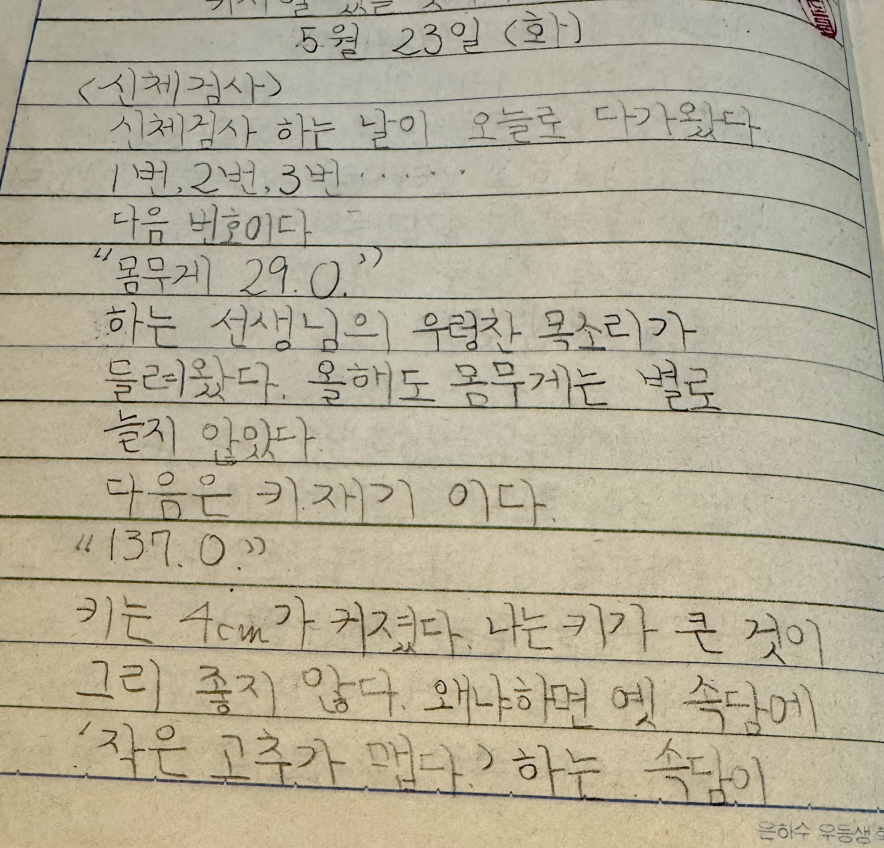 그때는 신체검사 때 키와 몸무게를 쩌렁쩌렁 불러주었구나. 일기를 보니 나는 작고 야무진 사람이 되고 싶었던 것 같다. (키가 작은 막내고모를 닮고 싶었는지도 모르겠다.) 큰 키도 아닌데 키가 커져서 안타까워하다니 어처구니기 없다. 저체중인 것 같은데 그걸 날씬하다고 하다니 그것도 안타깝다. 미디어 영향을 현재보다는 훨씬 덜 받을 때였겠지만 알게 모르게 키는 커야 하고 몸무게는 적게 나가야 좋은 거라고 생각하기 시작하지 않았을까. 그때 더 영양가 있게 실컷 먹고 역동적인 활동을 더 했으면 좋았을 것을. 그것이 아쉽다.