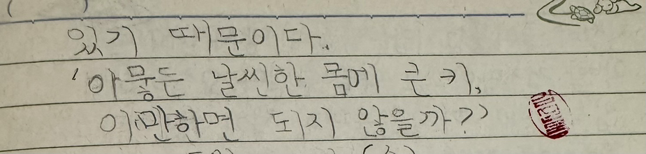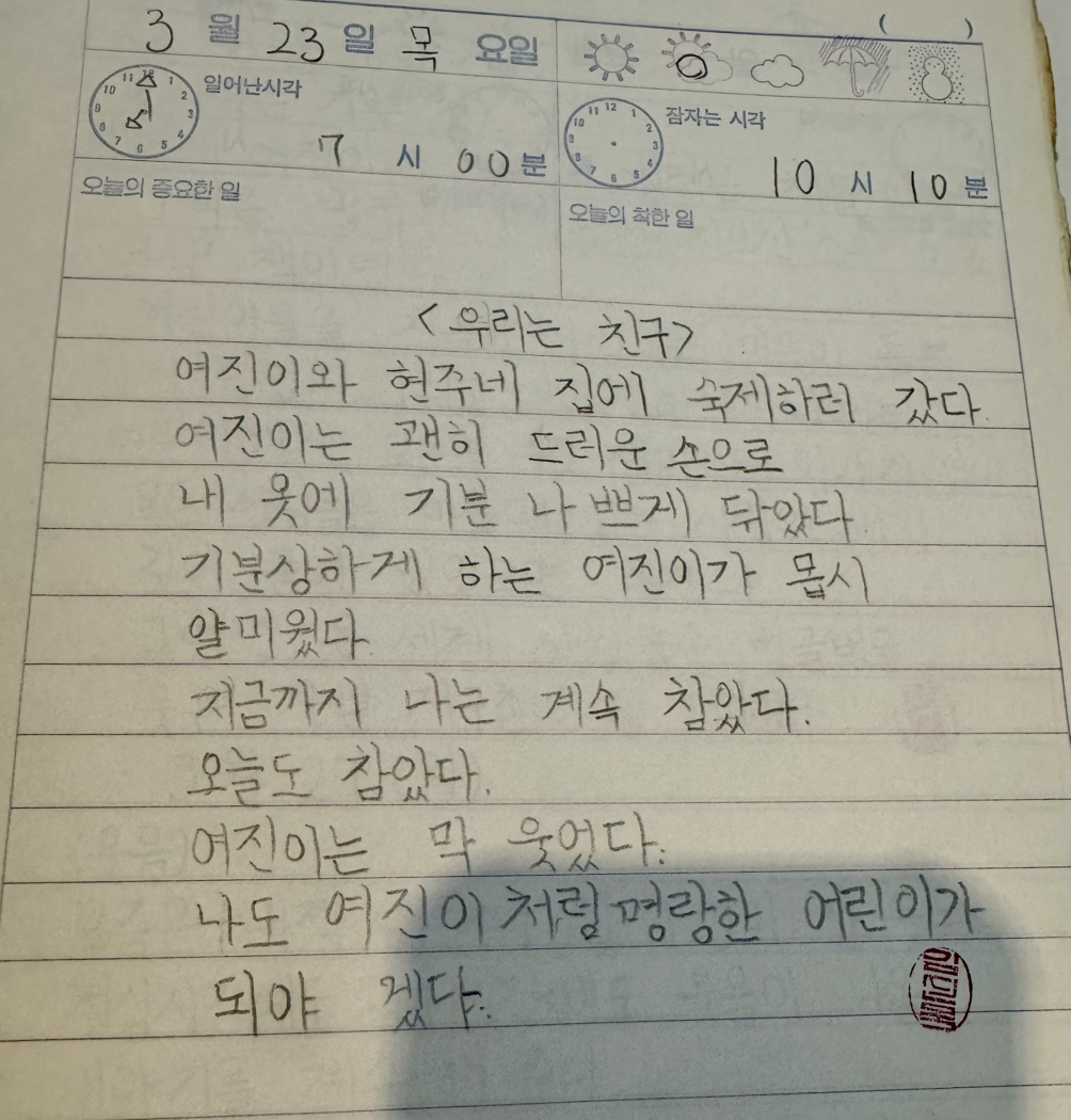일기에는 여진이의 불편한 행동에 참고 참고 참는 모습만 적었다. 그럴 땐 따끔하게 한마디 해야지 어이없게도 그 아이의 어떤 점을 본받고 싶다는 얼토당토않는 결론을 내린다. 지금의 나라면 무표정으로 지긋이 친구 눈을 깊게 바라보면서 “그만해. 기분이 나빠”라고 차분하고 또렷하게 말하겠다.
