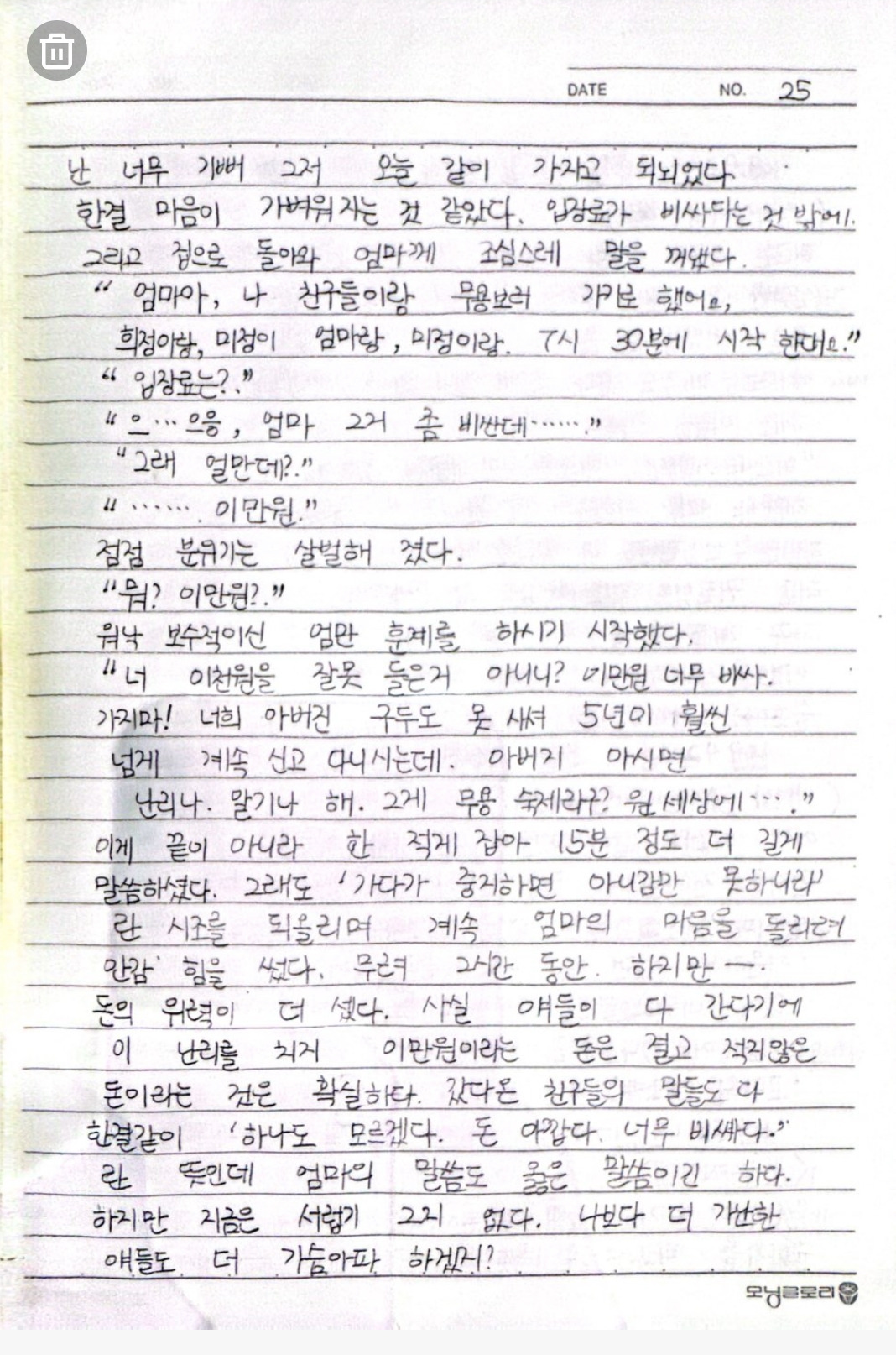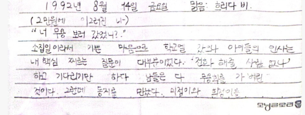 선생님은 우리 1학년들에게 여름방학 숙제로 ‘무용공연 보고 감상문 써오기‘를 내주셨다. 하.. 무용공연이 웬 말이람. 안 해가도 될 줄 알고 안일하게 있다가 어디서 소문을 들었던지 갑자기 꼭 해가야 한다는 생각에 마음이 조급해졌다. 인터넷도 없어 정보가 귀한 시절이라 누군가가 어디에 무슨 공연있데더라 하면 그냥 거길 따라가야 하는 상황이었다. 간신히 한 군데 알아왔더니 이번엔 2만 원이라는 가격이 문제였다. 당시에 김밥을 1700원에 팔고 있던 엄마에게 2만원짜리 공연 보러 간다고 했다가 절약의 중요성에 대해 일장연설을 들어야 했다.