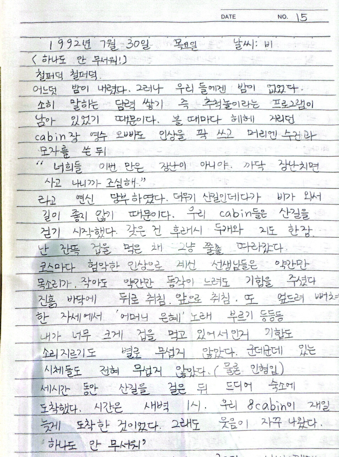 교리선생님들은 그 프로그램을 위해 아침 체조도 만들고, 야밤에 산행 루트도 짜고 정말 공을 많이 들였을 것 같다. 이 날의 일정의 마무리는 담력훈련 같은 야간 산행이었다. 지도를 보면서 꼭 찍고 가야 하는 지점들을 거쳐야 했다. 각 베이스마다 교리샘들이 있어서 그때마다의 미션을 주고 우리는 수행했다. 일종의 군대식 얼차려 같은 것이었는데 그러면서 협동심도 기르고 담력도 좋아지지 않았을까 싶다. 그렇게 며칠 부대끼며 지내면 당연히 많이 가까워졌다.