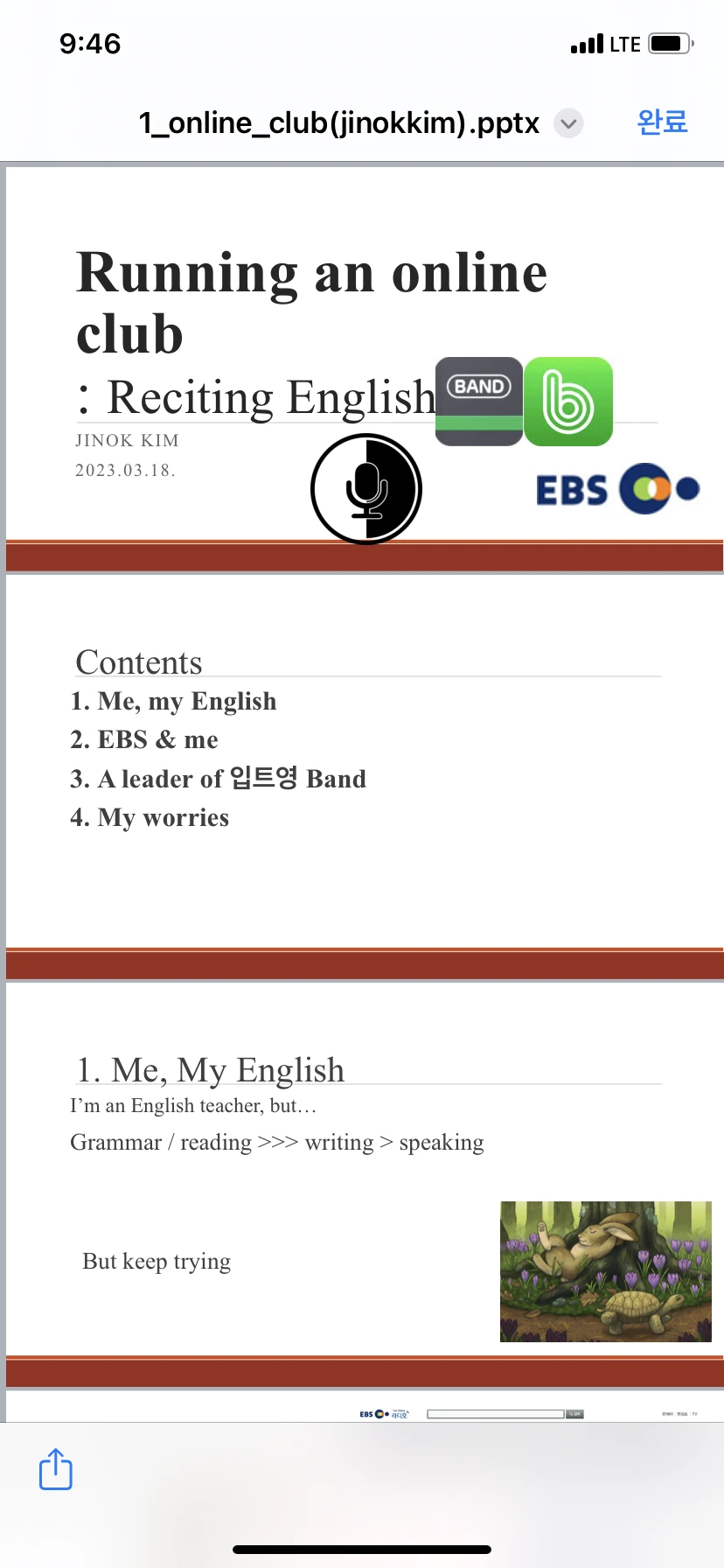 이 징글징글한 영어는, 난 썩 좋아하지 않는데 이제 삶의 일부가 되어버렸다. 이것은 마치 부부가 중매로 만나 살맞대고 오래 살다보니 그 연의 시작이 연애였는지 중매였는지 하등 중요하진 않은 그런 사이가 되어버린 것 같다. 그러다 영어로 대학원까지 다니게 되었다. 이번 학기에는 영어 발표수업을 하나 듣는데 수업 내용은 별 게 없고 매시간 영어나 수업과 관련된 주제로 발표를 하고 질문받고 질문하는 것이다. 난 오늘 입트영을 주제로 첫 발표를 했다. 얼마나 영어말하기에 자신이 없는지, 얼마나 직업을 밝히기가 부끄러운지. 그러다 어떻게 입트영을 만나 매일 그 인연을 이어가고 있는지. 어쩌다 내 영어도 영어지만 열정적인 운영자가 되었는지를.. 무려 영어로 한 15~20분 정도 이야기했다. 이제껏 학교 다닐 때 영어발표를 몇 번 했지만 이렇게 스크립트가 전혀 없이 슬라이드만 잠깐 보고 내 이야기를 영어로 풀어낸 것은 처음인 것 같다. 여전히 떨고, 간혹 말문이 막혔지만 질문도 많이 받아 총 40분간 앞에 서 있었다. 사실 오늘의 이 순간을 기억하고 싶어서 쓰기 시작했다. 이제 처음 엄마 없이 심부름을 간 날처럼 뿌듯했다. 계속 이렇게 죽이 되든 밥이 되든 자꾸 하다 보면 얼추 유창해지지 않을까.