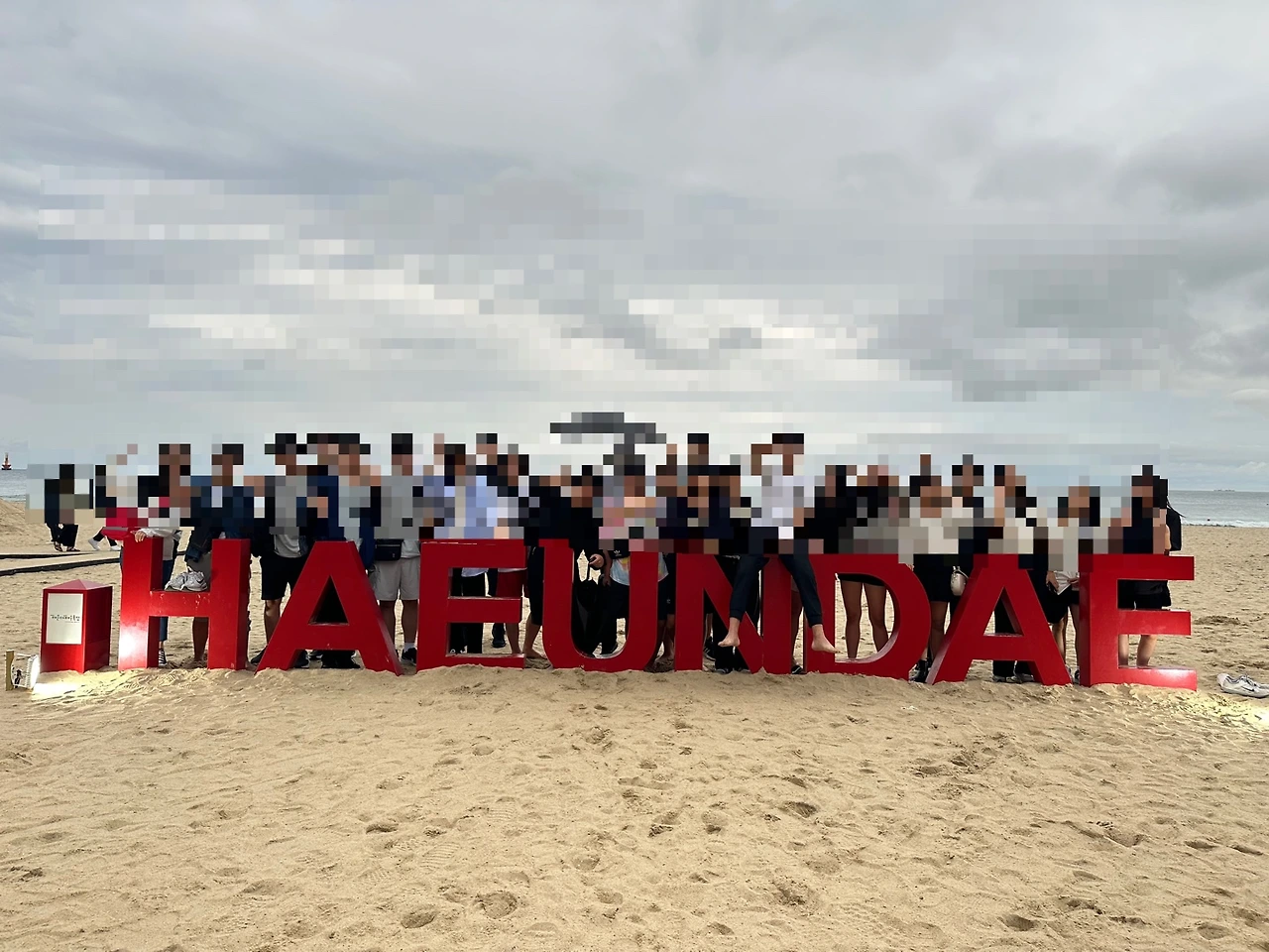 둘째 날 마지막 일정은 해운대 해변 산책이었다. 내내 흐린 날씨에 저녁 7시부터 비예보가 있었다. 우리가 해변에 도착한 시각은 6시 40분 즈음. 해변에서 재빨리 단체사진을 찍고 잠깐 산책을 하고 급히 돌아오려는 계획이었다. 비는 곧 쏟아질 거 같고 애들은 “바로 숙소 가면 안돼요?”라고 군소리를 했다. 나도 여길 굳이 가야 하나 고민하다가 눈 질끈 감고 갔는데 웬걸 바다를 본 애들은 갑자기 다들 천진한 얼굴이 되면서 좋아했다. 안 왔으면 어쩔뻔했나 싶게 사진을 찍고 일부는 신발을 벗었다. 마침 모래축제도 하는 중이어서 분위기가 더 좋았다.