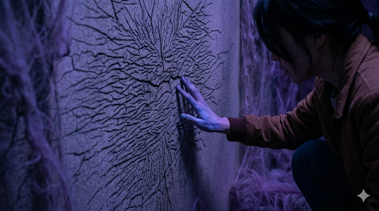 창고 벽면 곳곳에는 얇게 눌린 주름 같은 흔적들이