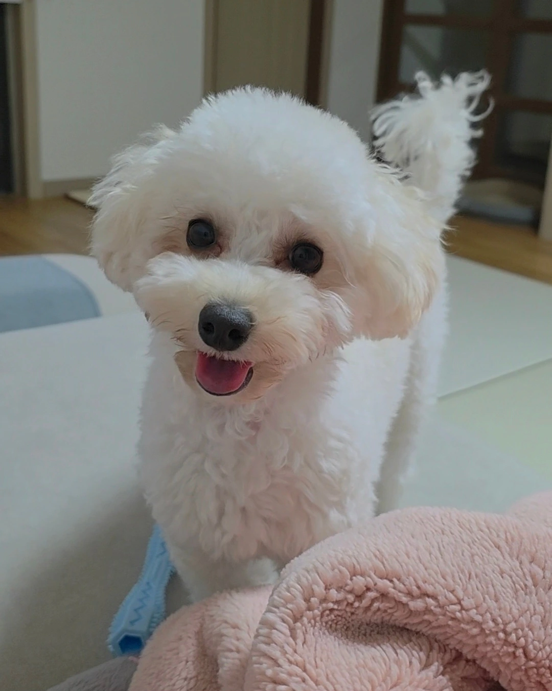 그러다 갑자기 폴짝 뛰어올라 내 가슴 위에 착지하더니, 얼굴에 뽀뽀 세례를 퍼붓는다.