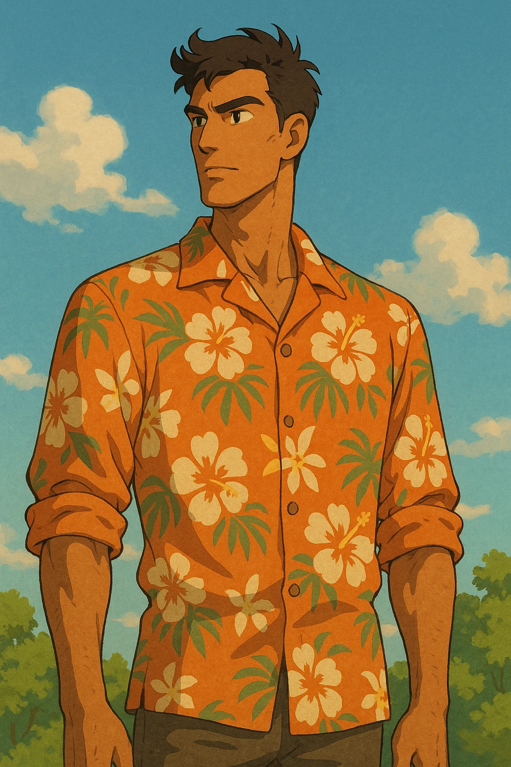 강렬한 하와이안 프린트가 크게 박혀있는 셔츠를 입은 그를.