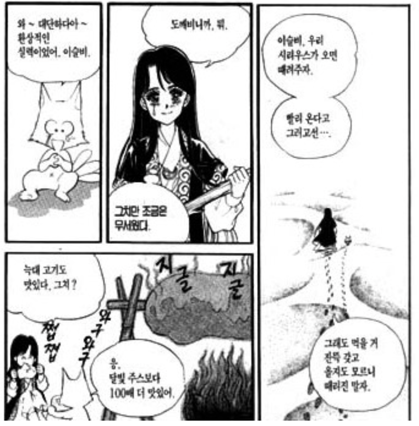 꿈같은 이야기가 펼쳐지는 중간중간 작품을 더더욱 맛깔나게 만드는 유머도 참 중요하다. 뭐랄까, 글밥만 있는 책에서는 쉽게 느껴지지 않는 재미라고나 할까. 유머는 만화를 정말 만화답게 만드는 매력의 요소로 다가왔고, 훗날 만화 뿐만 아니라 다른 형태의 스토리텔링을 접할 때, 그리고 심지어 현재 내가 어린이 독자들을 위한 스토리텔링을 고민할 때에도 적지 않은 영향을 미치는 것 같다.