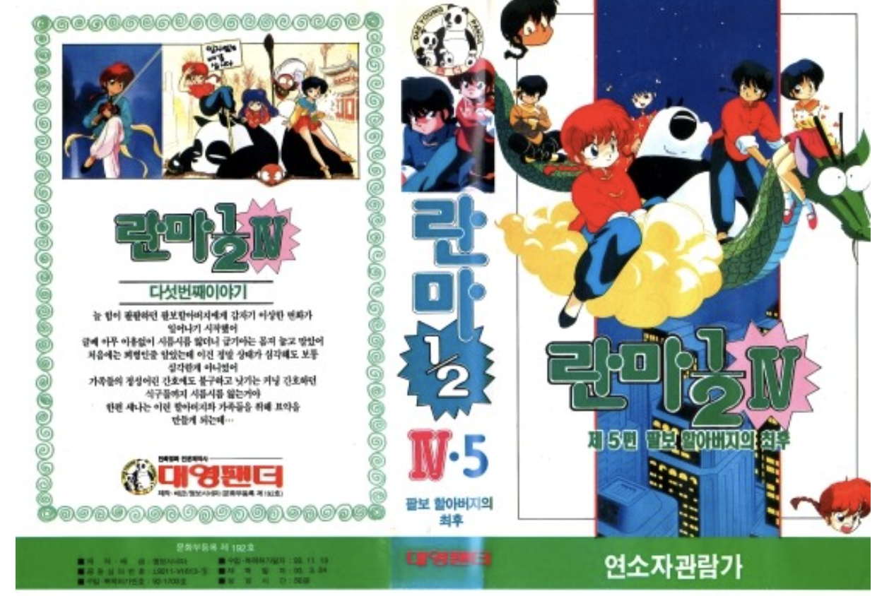 두 매체를 관통하는 만화 스토리로 어떤 걸 뽑을까 고민해야 했다. 당시 내가 좋아했던 만화 중 종이책과 영상물이 모두 나온 작품들이 꽤 있었는데 코찔찔이 유치원/초등학교 1학년 즈음에는 '둘리'나 '영심이', '달려라 하니', '날아라 슈퍼보드'와 같은 한국 작품들을 주로 보다가 콧물을 흘리지 않게 될 즈음에 일본 작가님들의 작품으로 넘어가게 된 것 같다. 후자 중에서 드래곤볼, 닥터슬럼프, 슬램덩크와 경합을 펼치다가 (아마도 앞서 작품들은 남성향에 더 가까워서인지) 최종적으로 바로 타카하시 루미코 작가님의 러브 코미디 <란마 1/2>을 골랐다.
