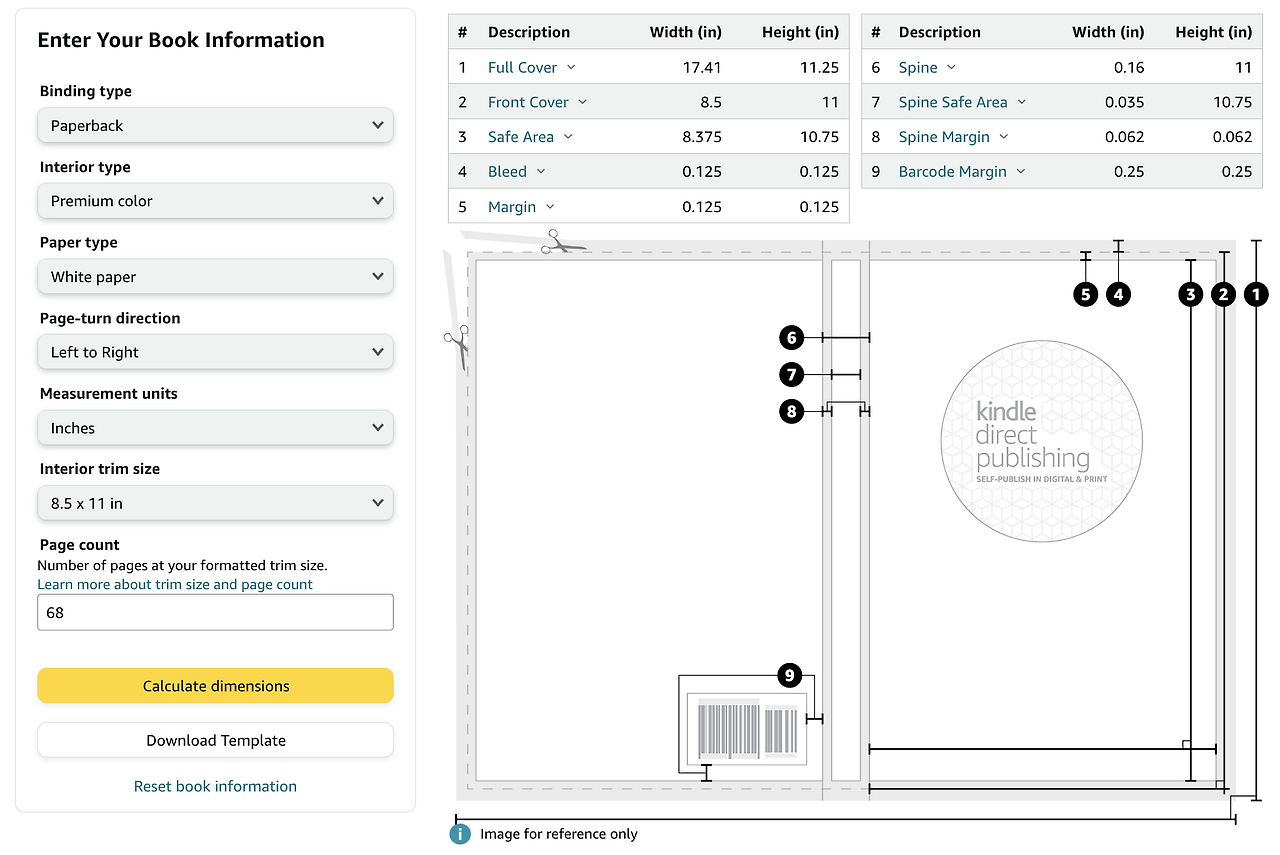 내지 파일을 다 만들고 나면 표지 파일을 따로 만들어 줘야 한다. 내지의 경우 종이책의 1페이지 사이즈로 만들지만 표지의 경우 책을 펼쳤을 때 2페이지의 사이즈에 가깝다. (그림책 수업에서는 이걸 바닥이라고 표현했고 미국에서 앨범 만들 때 종종 스프레드라는 단어를 사용했다) 2페이지의 사이즈와 똑같은 게 아니라 '가깝다'라고 표현하는 이유는 내지의 종이 재질을 무엇으로 하냐, 그리고 몇 장으로 제작되는지에 따라 책등의 두께가 달라지기 때문이다. 표지의 경우 아마존 KDP사이트 표지 계산기에 들어가서 표지 사이즈 계산을 한 뒤에 템플릿을 다운받아서 그것에 맞추어 제작해주어야 한다.