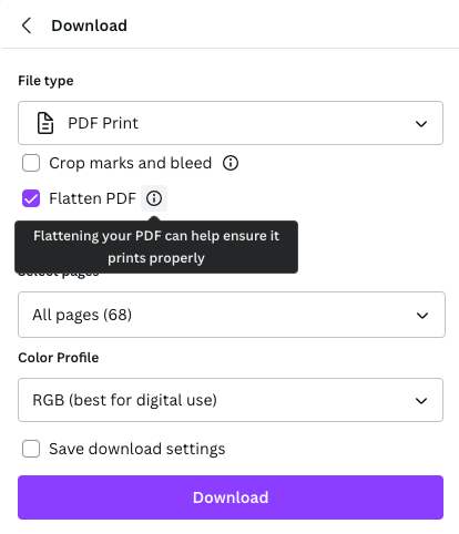 페이지를 모두 만들고 이제 다운로드를 할 차례! 이 부분도 유튜버 선생님들이 하라는 대로 해보았다. PDF Print로 파일 타입을 설정해 주고 인쇄가 잘 될 수 있도록 돕는다는(무슨 이유인지는 파악 못함 ㅋ ㅠㅠ) Flatten PDF까지 클릭해 준다. 마지막에 Color profile의 경우 디지털에 최적인 RGB 옵션과 프린팅에 최적인 CMYK옵션 두 가지를 제공하는데 캔바 무료 버전의 경우 RGB만 가능하고 위의 유튜버 헤더님도 RGB만으로도 충분한 것 같다는 의견을 주셔서 나도 그렇게 진행했다. 다운로드 버튼을 클릭하면 아마존 KDP 사이트에 업로드할 수 있는 PDF 파일이 뿅! 만들어진다.