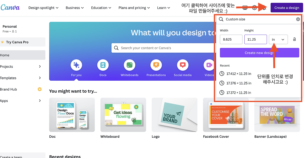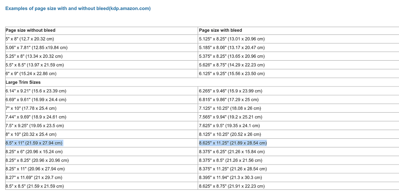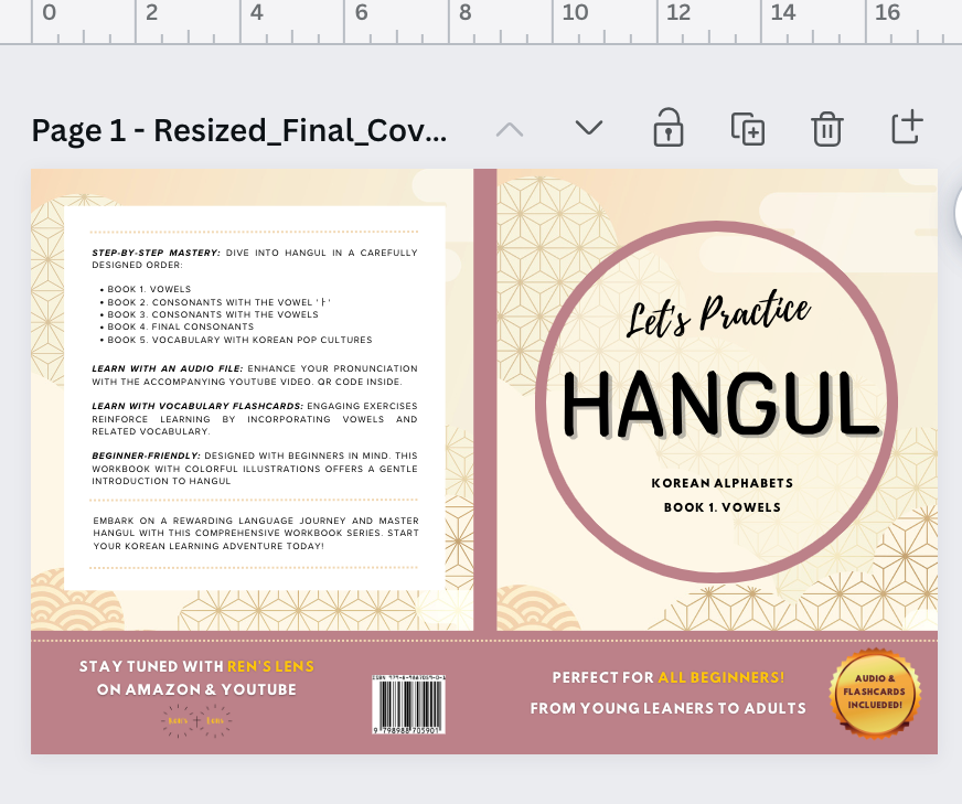 좀 더 구체적으로 기록해 두자면 나는 위 영상을 따라 해서 8.5*11 (인치) 사이즈 책을 만들게 되었고 아마존에서 보여주는 표에서 사이즈 (Page size with bleed)를 확인한 뒤 캔바로 와서 8.625*11.25로 커스텀 사이즈를 만들어 내지를 만들기 시작했다. 나중에 인쇄가 되고 나서 보니까 생각보다 8.5*11 사이즈책이 커서 이 부분이 조금 후회가 된다. 한글 워크북을 5권 정도 시리즈로 만들 생각을 했기 때문에 살짝 마음에 들지 않는 사이즈래도 발이 묶이게 되었다 ㅋ