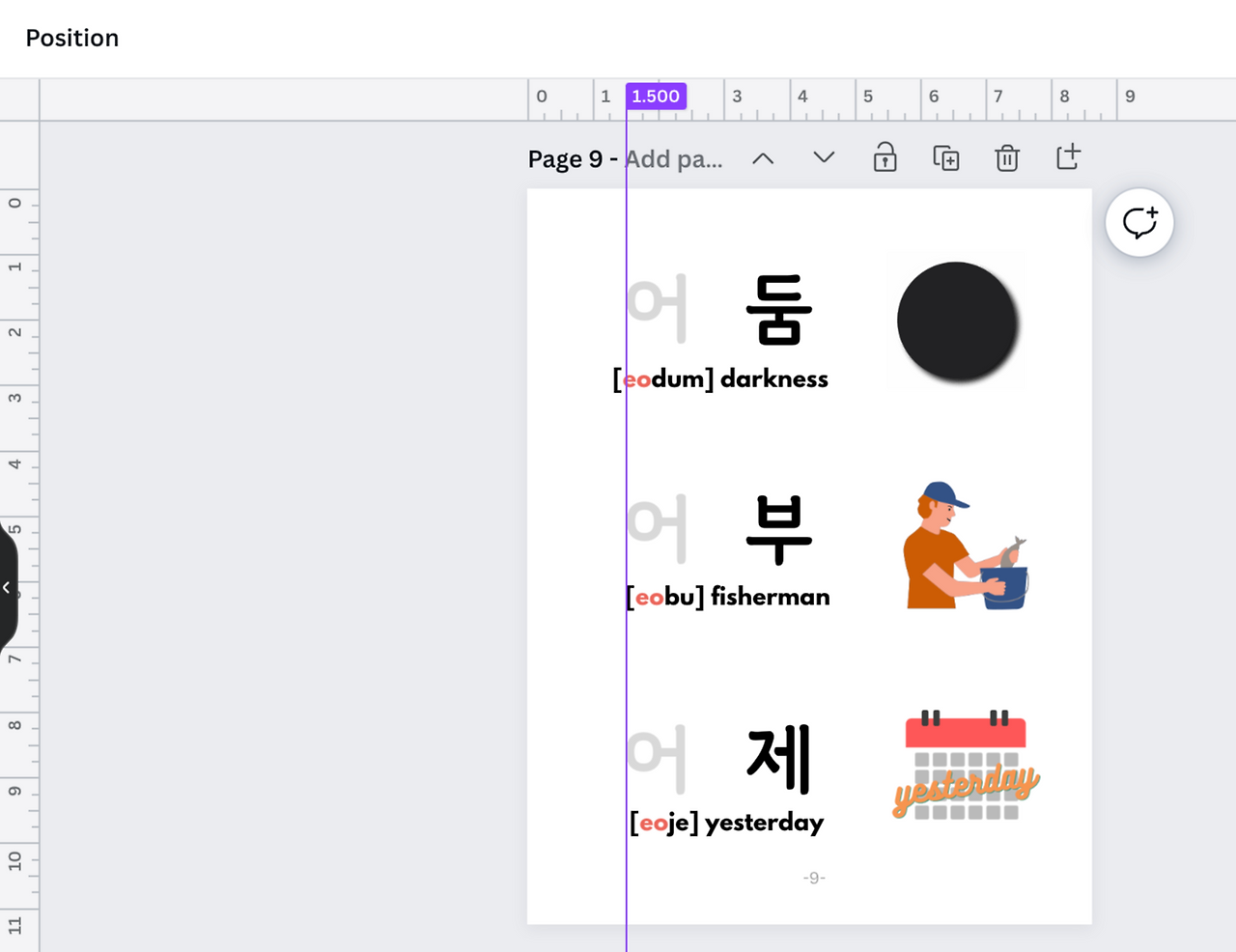 왕초보가 워크북을 제작해 나가면서 절절이 깨달은 한 가지는 정렬이 중요하다는 것!!! 예를 들면 이번 책은 모음에 대해 배우는 책이었고 일정한 형식이 반복되는 형태였다. 처음에는 모든 것이 처음이라 어리바리한 내가 페이지 하나하나 만드는 데에 정신이 팔려 10장 넘게 만들었는데....... 정신 차리고 스크롤을 내리며 전체적인 느낌을 보는데 미묘하게 삐뚤빼뚤!!!! ㅋㅋㅋㅋㅋ 책장을 넘기다 보면 텍스트나 이미지가 위로 갔다 아래로 갔다 이런 느낌? 이거 산만해가지고 공부 가능한가? ㅋㅋㅋㅋㅋ