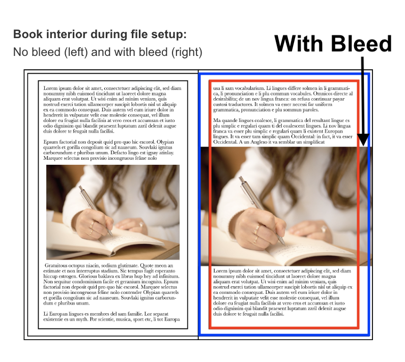 출판에서 사용되는 의미로 트림(Trim)은 자르는 선, 즉 종이 크기라고 보면 되고 블리드(Bleed)는 이미지나 텍스트가 안전하게 인쇄되는 안전지대 밖으로 잉크를 살리는 것을 의미한다. 즉, 종이 끝까지 그림을 살릴 수 있는 '가장자리 배치'라고 한다. 하단의 사진에서 보면 빨간 선이 인쇄 안전지대이고 파란 선이 종이를 자르는 트림선인데, 블리드는 오른편에 나온 예시처럼 빨간 선 밖으로 그림이 줄줄 흘러나와 종이 끝까지 나가는 타입을 의미한다. 안전지대 밖으로 '잉크'라는 피가 흘러나온다고 생각하면 되려나? (좀 무시무시하네;)