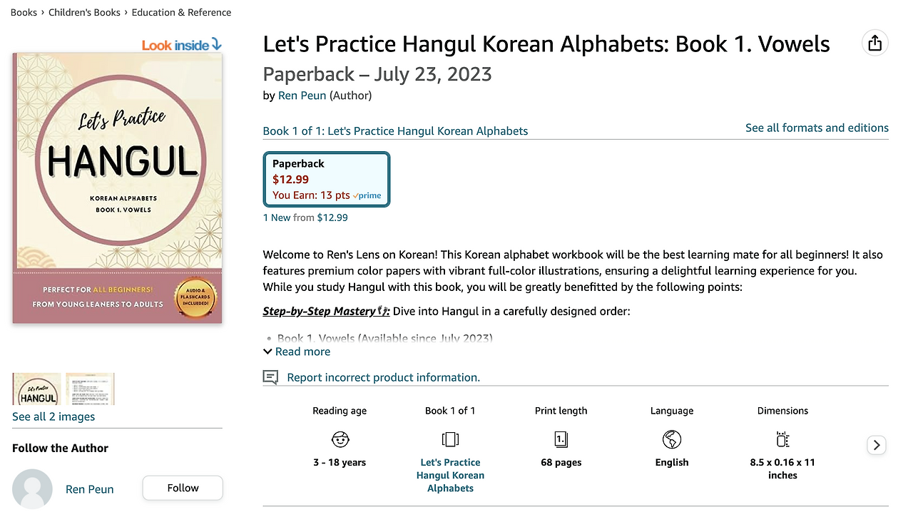 3) Series(시리즈물): 내 책의 경우에는 시리즈로 등록은 해두었다. 1권은 모음, 2권 자음, 3권 받침 등의 순서로 만들려고 계획했기 때문이다. 이제 달랑 1권이라 시리즈 관련사항이 어떻게 되는지는 자세히 모르겠다.