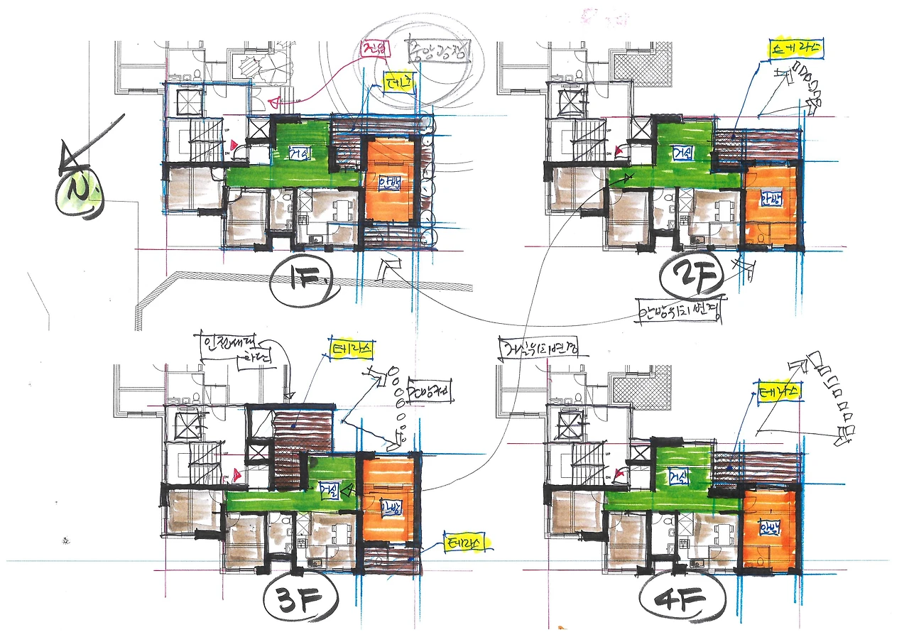 아파트와 단독주택 사이, 빌라를 바라보는 건축가의 시선은 바로 그곳에 있다. 아래는 각 층별 평면 컨셉 스케치다.