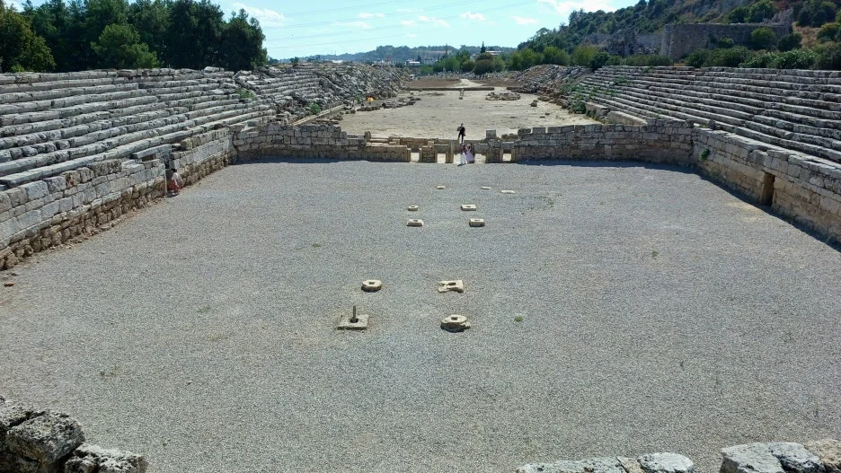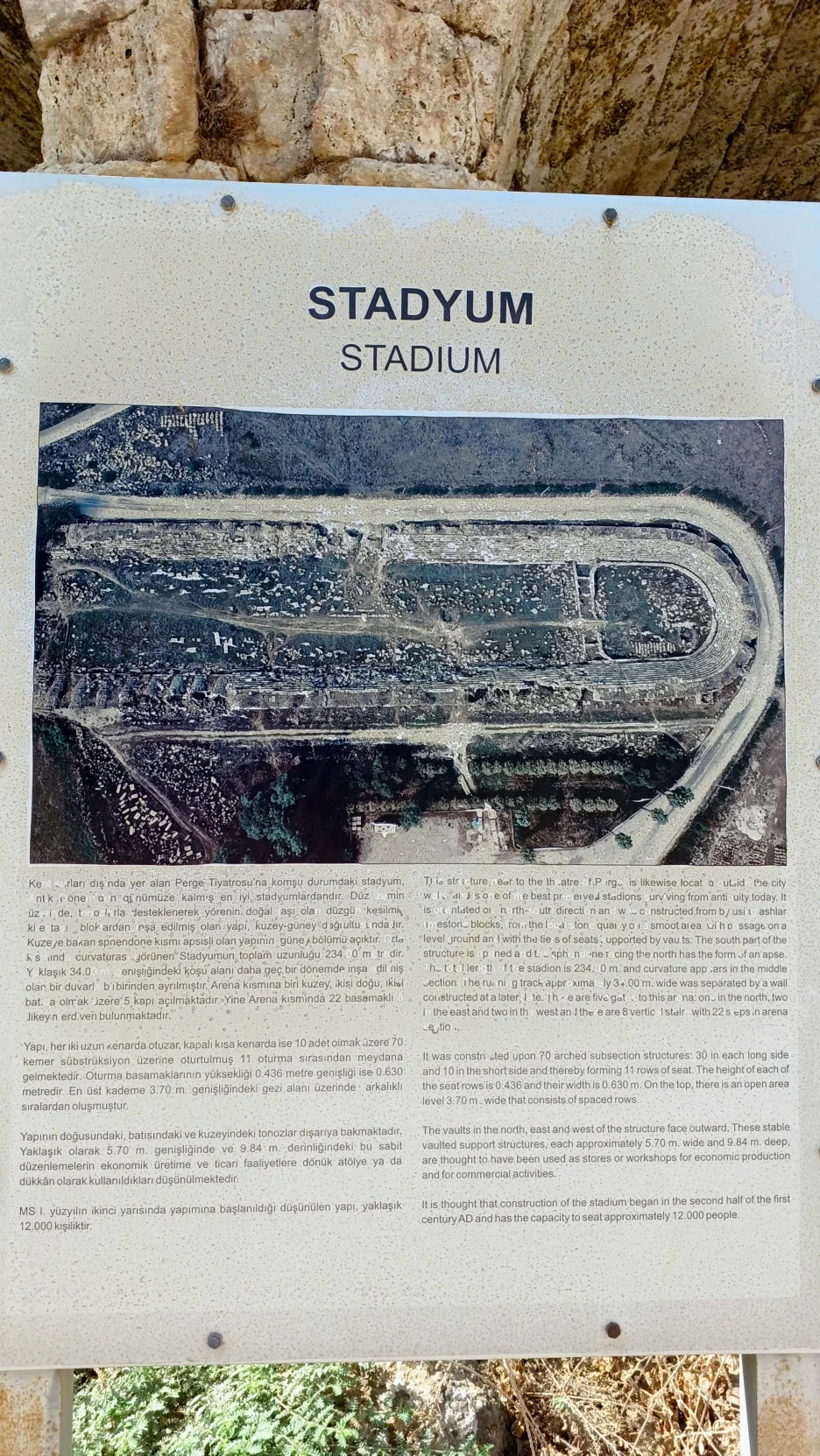 더 안쪽으로 걸음을 옮기자, 로마 시대 경기장이 눈앞에 나타난다. 반원형 관중석은 곳곳이 무너져 있었지만, 그 규모만으로도 이 도시가 한때 품었던 위엄을 보여준다. 길이 약 234 미터, 폭 약 34 미터에 이르는 거대한 경기장은 좌석 수가 약 12,000명 규모였다고 한다. 연속아치 구조물 위에 돌좌석이 겹겹이 쌓였고, 수많은 사람들이 경기장 안팎을 오가며 경쟁하고 환호했을 것이다. 이 경기장은 단순히 스포츠를 위한 공간이 아니었다. 검투사의 격투, 동물 사냥, 육상 경기 등 폭력과 오락이 뒤섞인 공간이었다. 그 시절의 페르게는 상인들의 외침과 검투사의 함성, 연극의 대사로 가득한 활기찬 도시였을 것이다. 지금은 잡초가 자란 돌길과 부서진 기둥만이 남아 조용히 그 시간을 증언하고 있다. J는 한동안 빈 경기장을 바라보았다. 마치 오래전 이곳을 가득 채운 함성의 메아리를 듣고 있는 사람처럼.