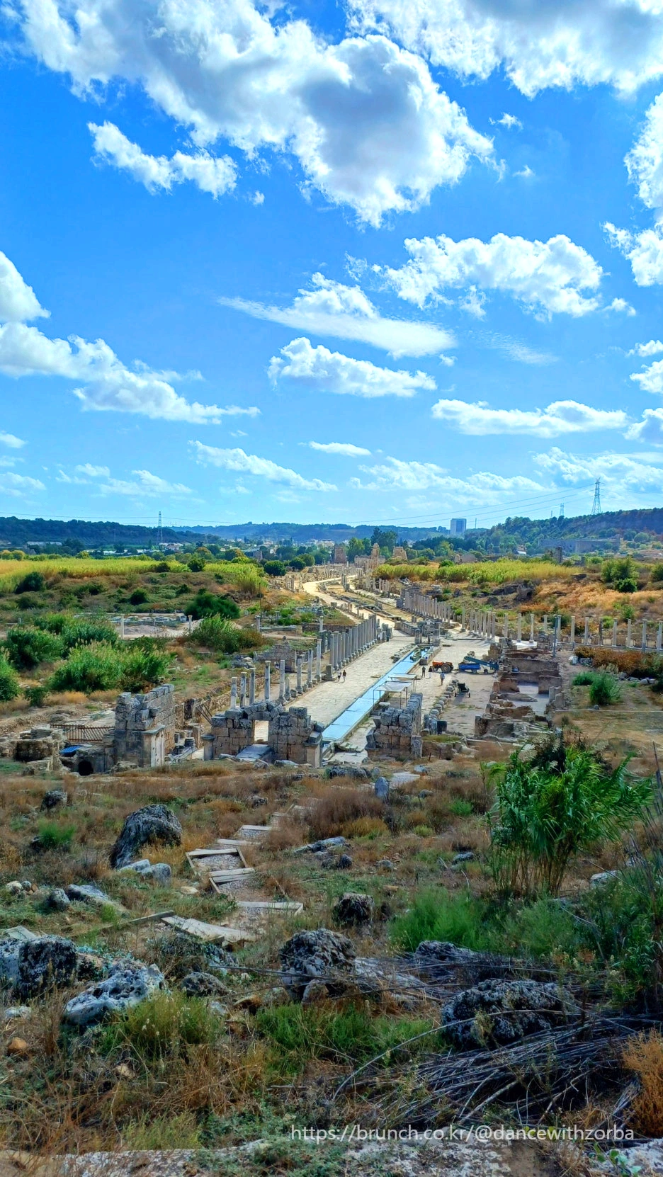 페르게의 하늘은 맑았다. 구름 한 점 없는 하늘 아래, 간헐적인 바람이 먼지를 일으키며 얼굴을 스친다. 그 바람에는 흙냄새와 마른풀의 향이 섞여 있다. 옛 도시의 윤곽이 가까워질수록 공기가 조금씩 달라진다. 단순한 바람이 아니라, 오래된 문명의 흙냄새가 배어 있는 듯하다. 이곳은 기원전 그리스인들이 정착하고, 알렉산더 대왕의 원정로에 스쳐간 도시다. 이후 로마 시대에 들어 팜필리아의 중심지로 번영을 누렸던 곳이다.