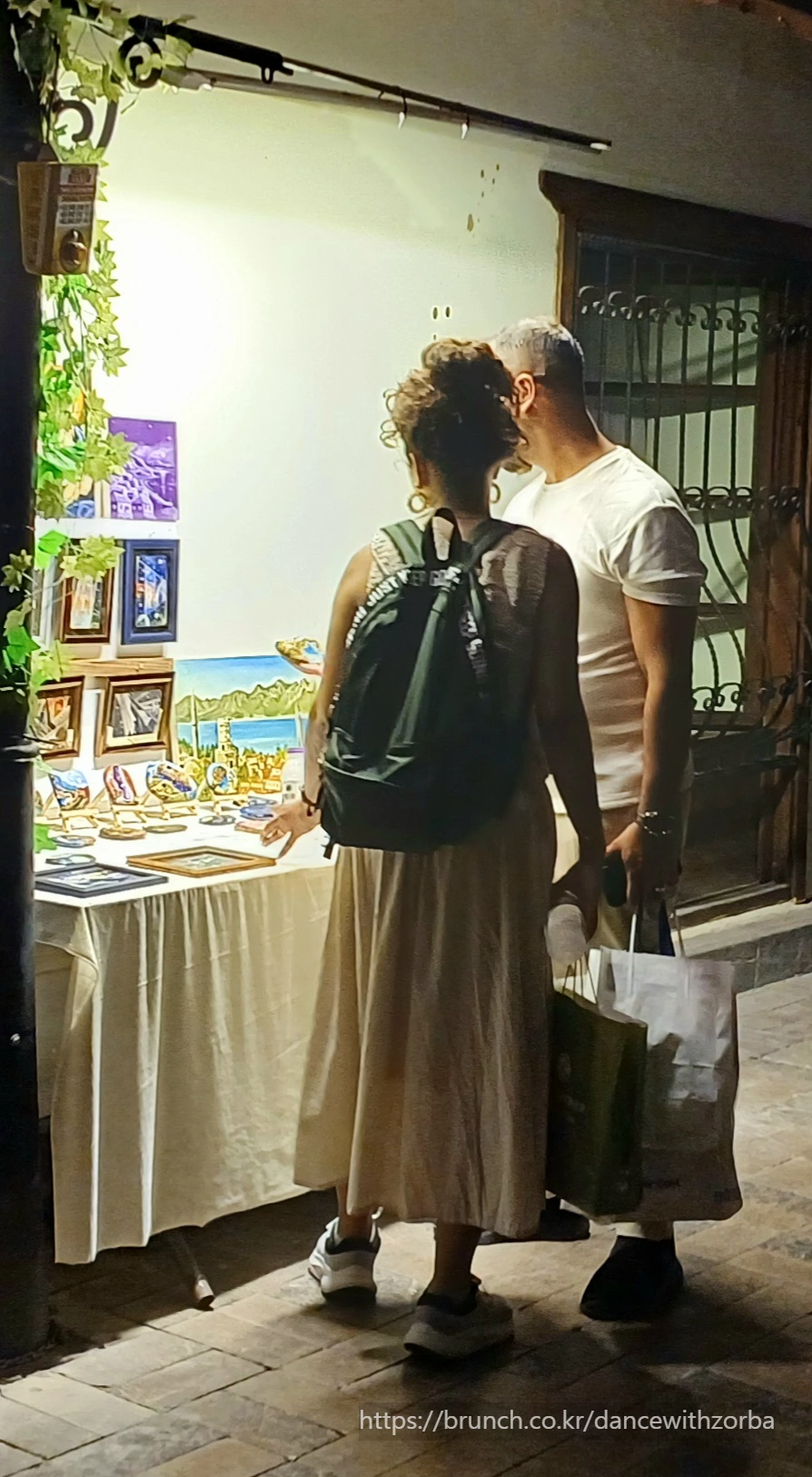 낮동안 데워져 아직 식지 않은 바닷바람이 골목 끝에서 은근하게 불어온다. 밤의 칼레이치 골목은 낮보다 훨씬 화려하다. 낮에는 고풍스러운 골목이었지만, 밤이 되자 갑자기 무대 위로 올라선 배우처럼 표정이 달라진다. 식당과 카페들은 경쟁하듯 불빛을 내걸고, 각자의 방식으로 여행자를 유혹한다. 주황빛 조명과 벽을 타고 흐르는 부겐빌레아의 붉은 꽃잎, 그 아래로 와인 잔을 부딪히는 소리와 웃음소리가 바람을 타고 천천히 골목을 흘러 다닌다.