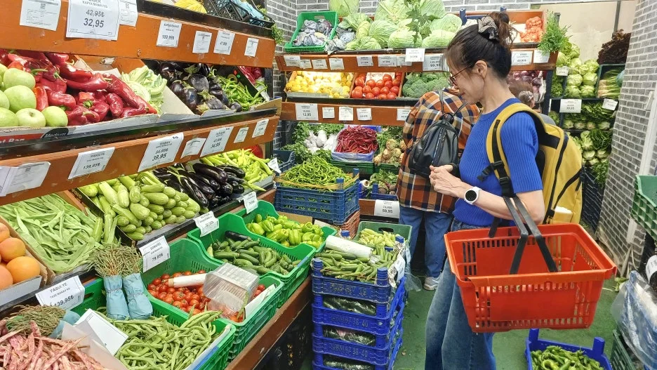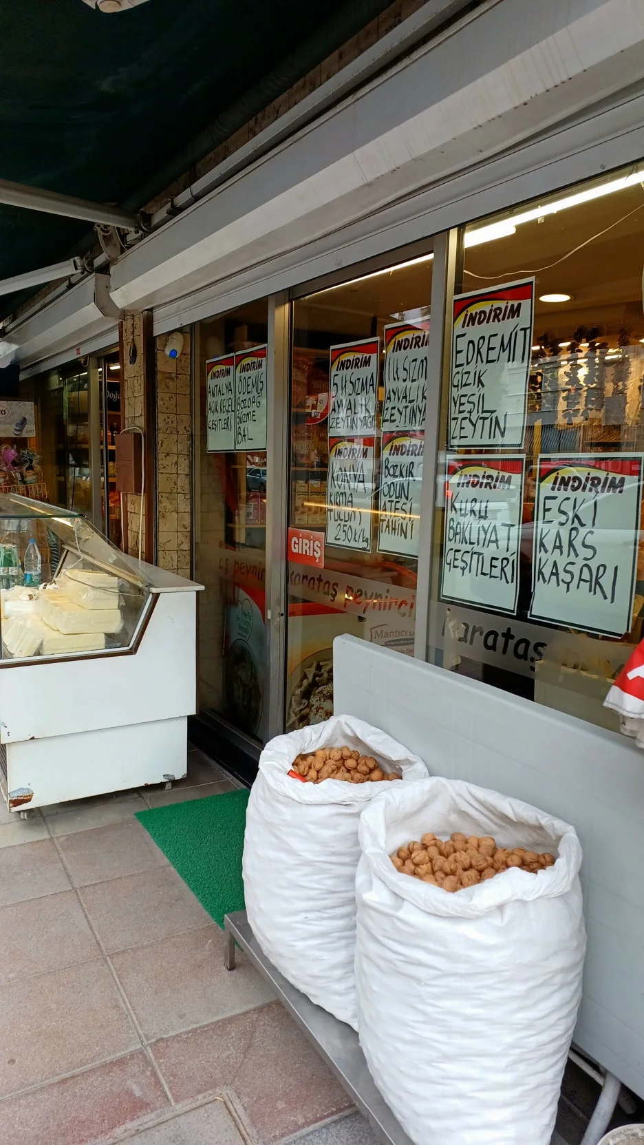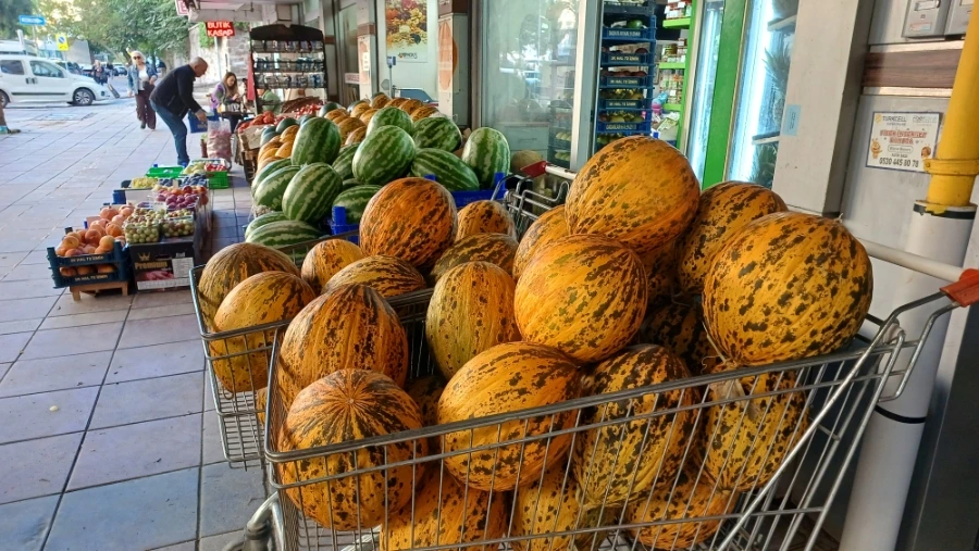 조금 더 걸어가자 식료품점이 보인다. 유리창에는 손 글씨로 쓴 'İNDİRİM(세일)' 안내문이 붙어 있고, 문 앞에는 커다란 자루에 호두가 수북이 담겨 있다. 가게 안에는 치즈, 올리브, 꿀, 말린 과일이 가지런히 진열돼 있다. 그 옆의 야채 가게는 천연 색으로 빛난다. 피망, 오이, 가지, 각종 과일 그 위로 터키어 가격표가 나란히 붙어 있다. J는 바구니를 들고 토마토와 양파, 가지를 고르며 신이 난 표정이다.