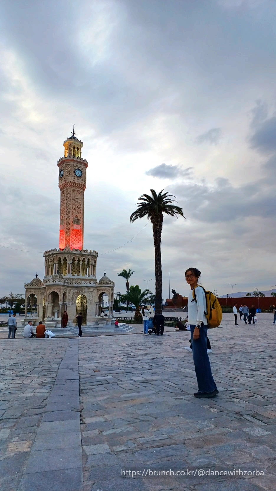 조금 더 걸으니 이즈미르 시계탑 광장(Konak Square)이 나온다. 하늘빛과 맞닿은 하얀 탑은 섬세한 조각으로 장식되어 있고, 저녁 불빛이 스며들며 은은히 붉게 물든다. 이 탑은 1901년, 오스만 제국 술탄 압둘 하미드 2세의 즉위 25주년을 기념해 세워진 것이다. 세월이 흘러 지금은 시의 상징이 되었고, 시청 차량이나 공공건물에는 어김없이 이 시계탑 문장이 붙어 있다. 탑 주위에는 비둘기 떼가 모여들고, 사람들은 탑 아래에 앉아 담소를 나누거나 사진을 찍는다. 옆의 야자수는 바람결에 천천히 몸을 기울이며, 마치 이 도시의 일상을 묵묵히 지켜보는 듯하다.