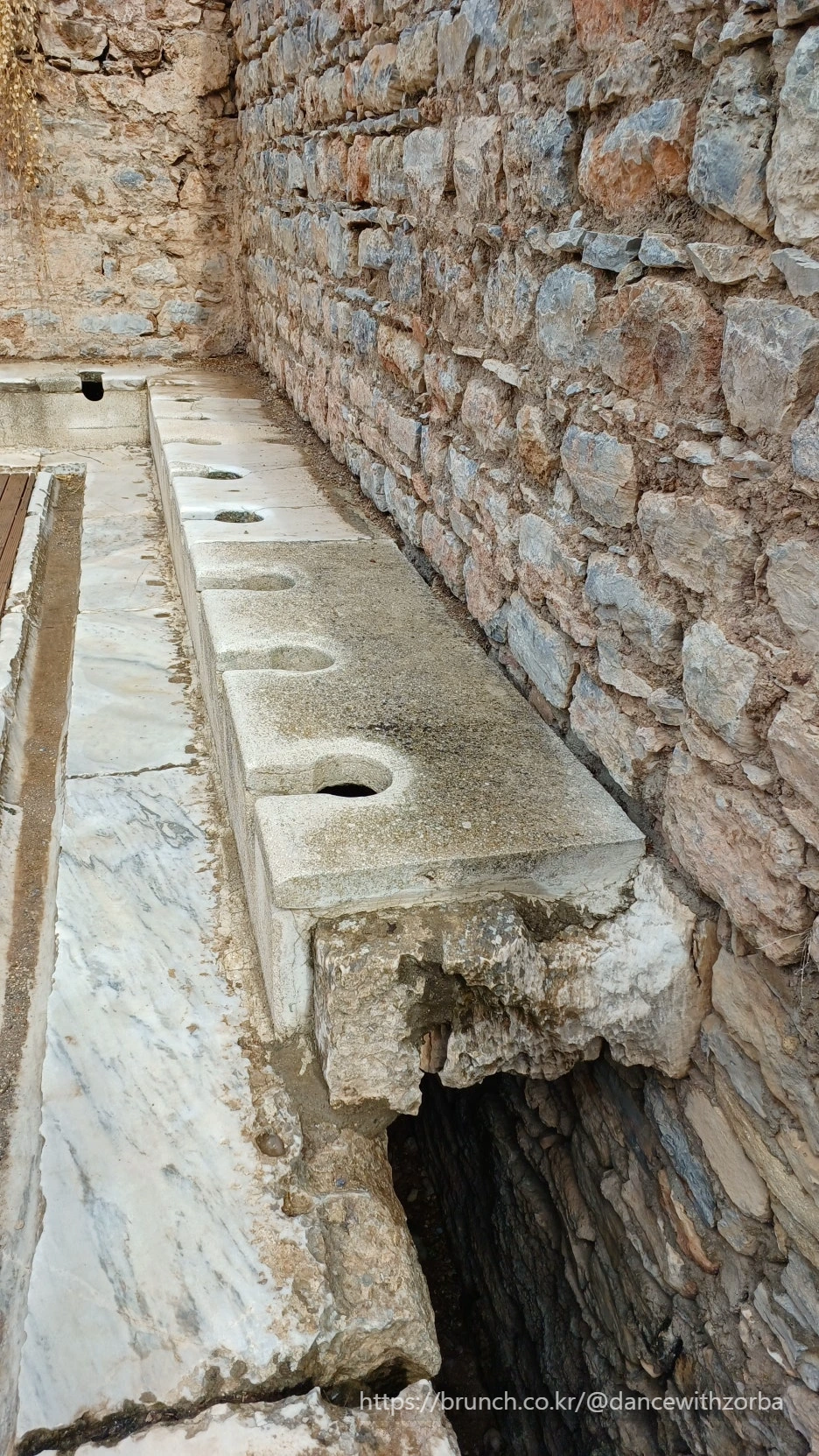 대리석 거리를 따라 원형극장 쪽으로 다시 걸어간다. 트라야누스 분수 자리에는 아직 물자국이 남아 있고, 물이 흘렀던 자리에 지금은 바람이 흐른다. 원형극장을 지나 항구로 뻗은 아르카디아 거리로 내려선다. 폭 11미터의 대리석 도로가 나란한 기둥들 사이로 곧게 이어진다. 비잔틴 황제 아르카디우스가 손질하면서 지금의 이름을 얻었고, 밤에도 등불이 켜졌다는 기록이 남아 있다. '아케이드(arcade)'라는 말이 이 거리의 이름에서 파생되었다.