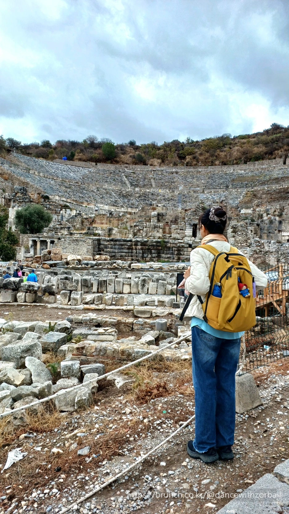 빗방울이 유리창에 부딪혀 번지며 뒤로 흘러간다. 운전사가 부지런히 핸들을 돌리는 동안, 창밖에는 낮게 깔린 구름이 산허리를 감싸 안는다. 창밖으로 ‘Efes(Ephesus) 1km’라는 갈색 표지판이 눈에 들어온다. 다시 설레기 시작한다.