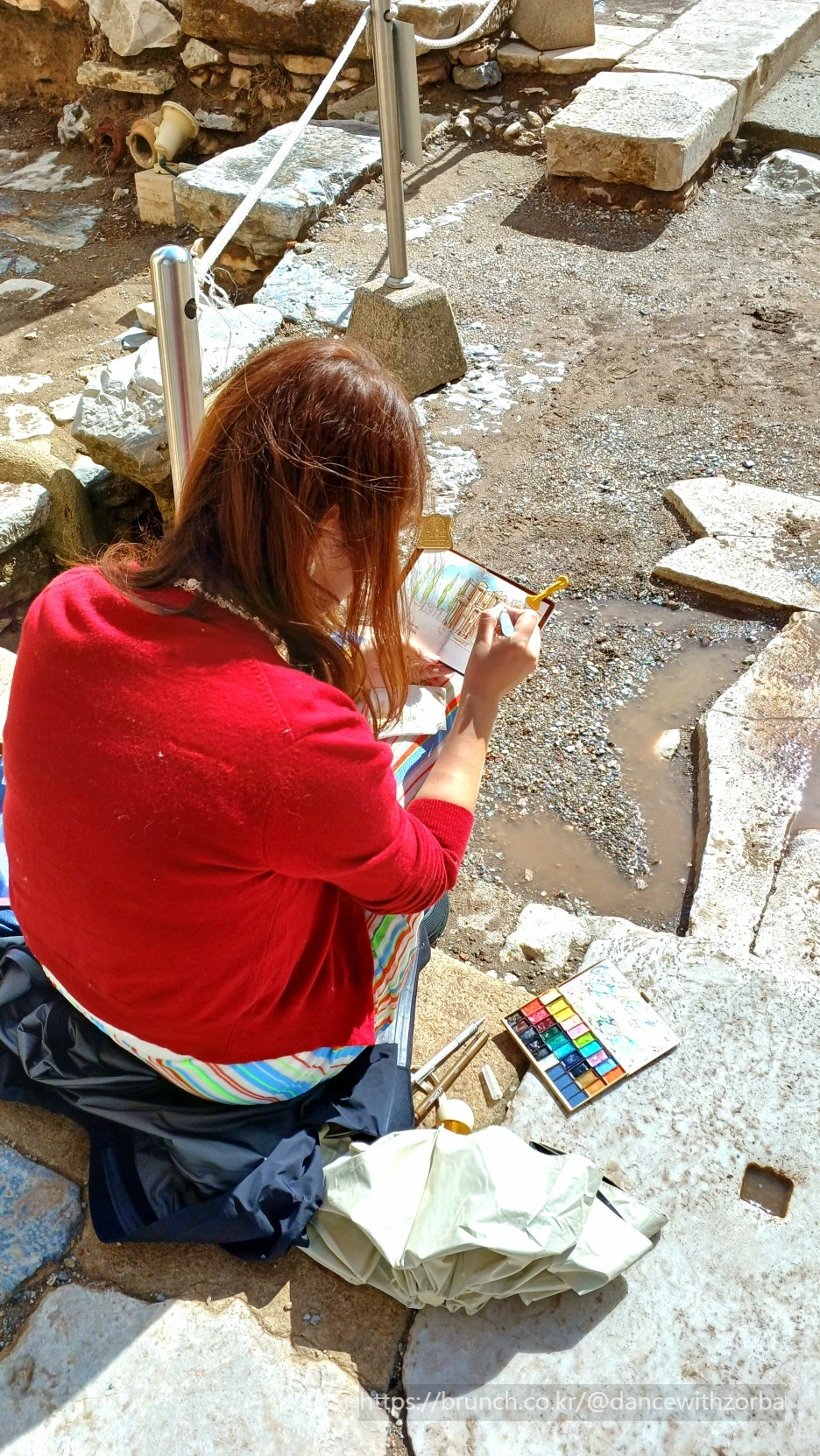 유적지에 다다르자 빗줄기가 잦아든다. 젖은 공기 속에서 햇살 한 줄이 내려앉고, 돌길은 그 빛을 반사하며 반짝인다. 빗물에 젖은 돌길을 밟을 때마다 신발 밑창이 조금씩 미끄러진다. 이 길을 따라 2천 년 전 사람들도 같은 바람을 맞으며 걸었을까?
