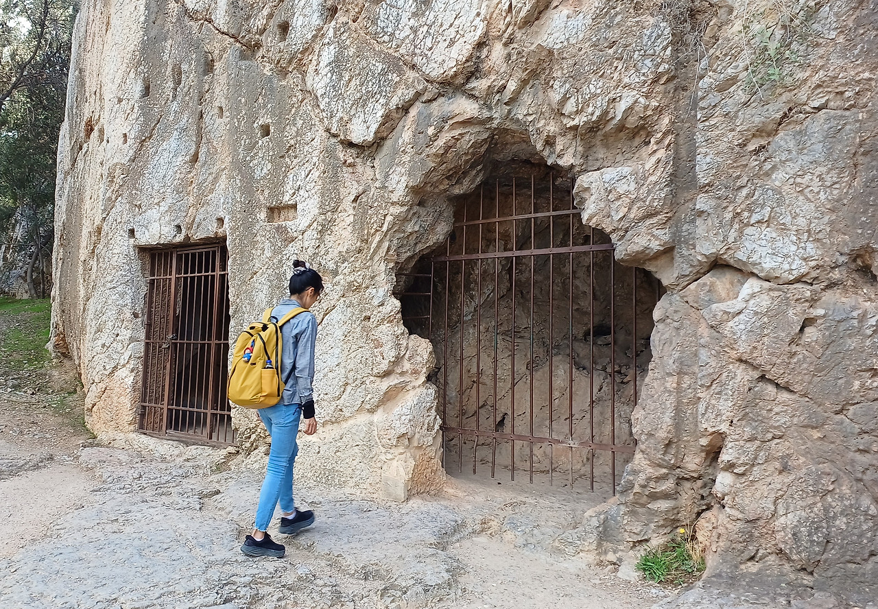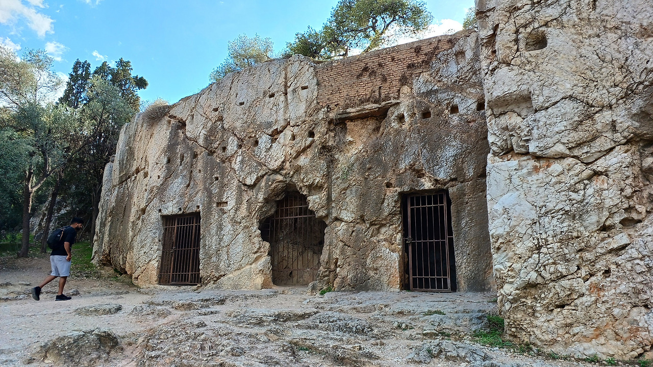 언덕 중턱을 오르는 길가에 작은 바위굴 하나가 보인다. 안내판에는 ‘소크라테스의 감옥(Socrates’ Prison)’이라는 이름이 적혀 있다. 실제로 그가 이곳에 갇혔다는 직접적 증거는 없지만, 오래전부터 아테네 사람들은 이 굴을 그의 마지막 장소로 전해왔다. 어두운 바위 틈은 햇살이 거의 닿지 않고, 입구만 희미하게 빛난다.