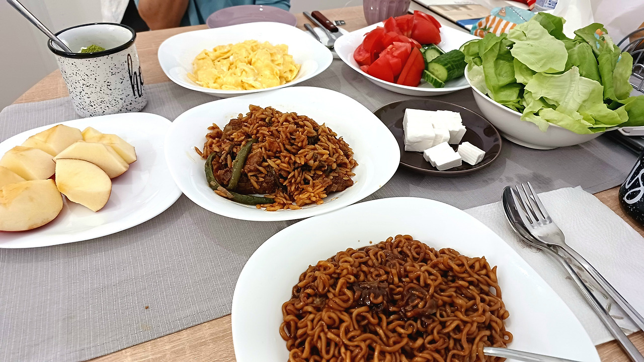 다만 하나의 요소만 조정한다. 후첨 올리브오일. 여긴 그리스다. 마트에 가면 긴 진열대가 모두 올리브 오일로 채워진 곳이다. 굳이 작은 비닐에 담겨 생색이나 내는 기름을 사용할 필요가 없다. 지역산 오뤼지널 엑스트라버진을 듬뿍 뿌린다. 순간, 풍미가 올라오며 라면은 극강의 요리로 변한다.