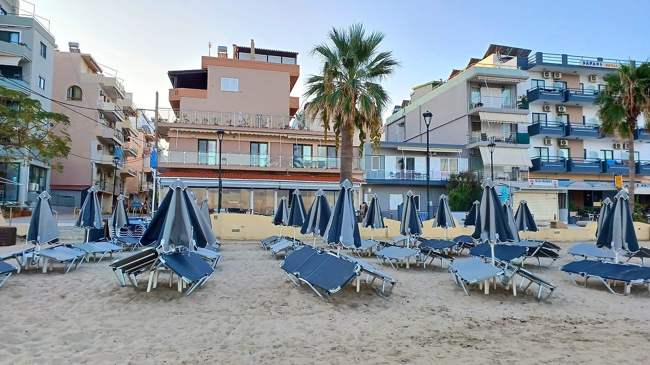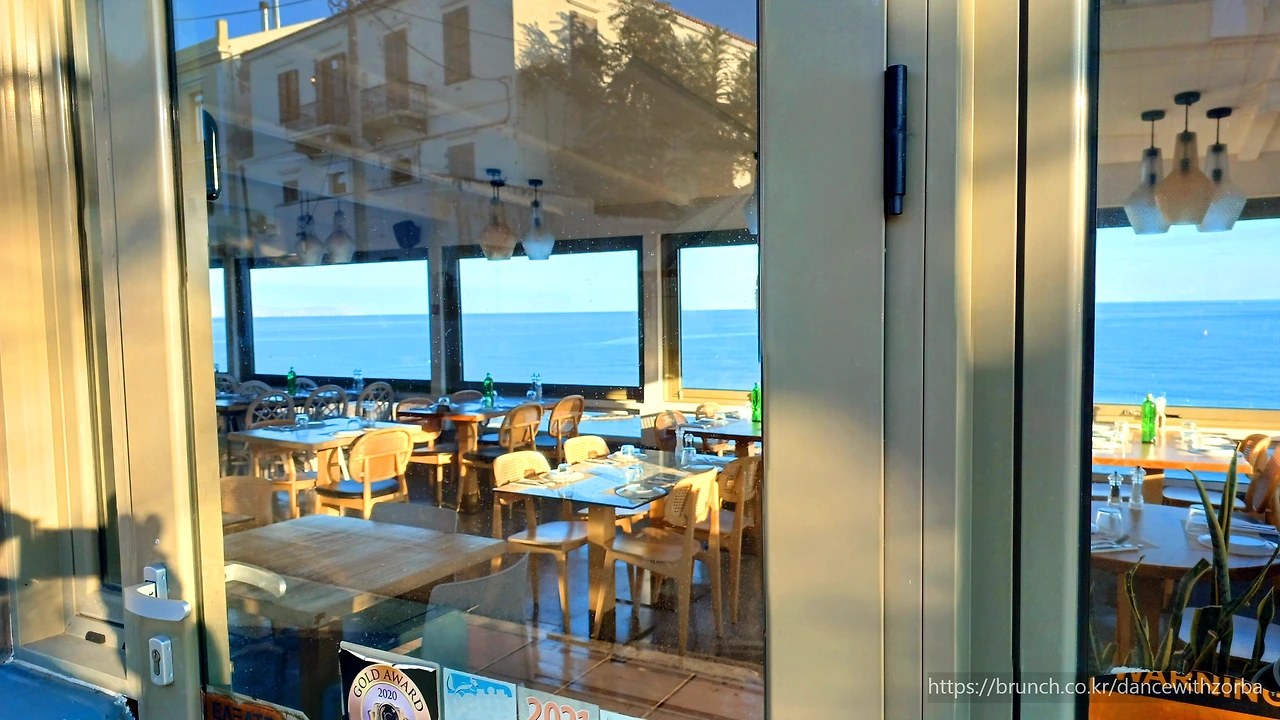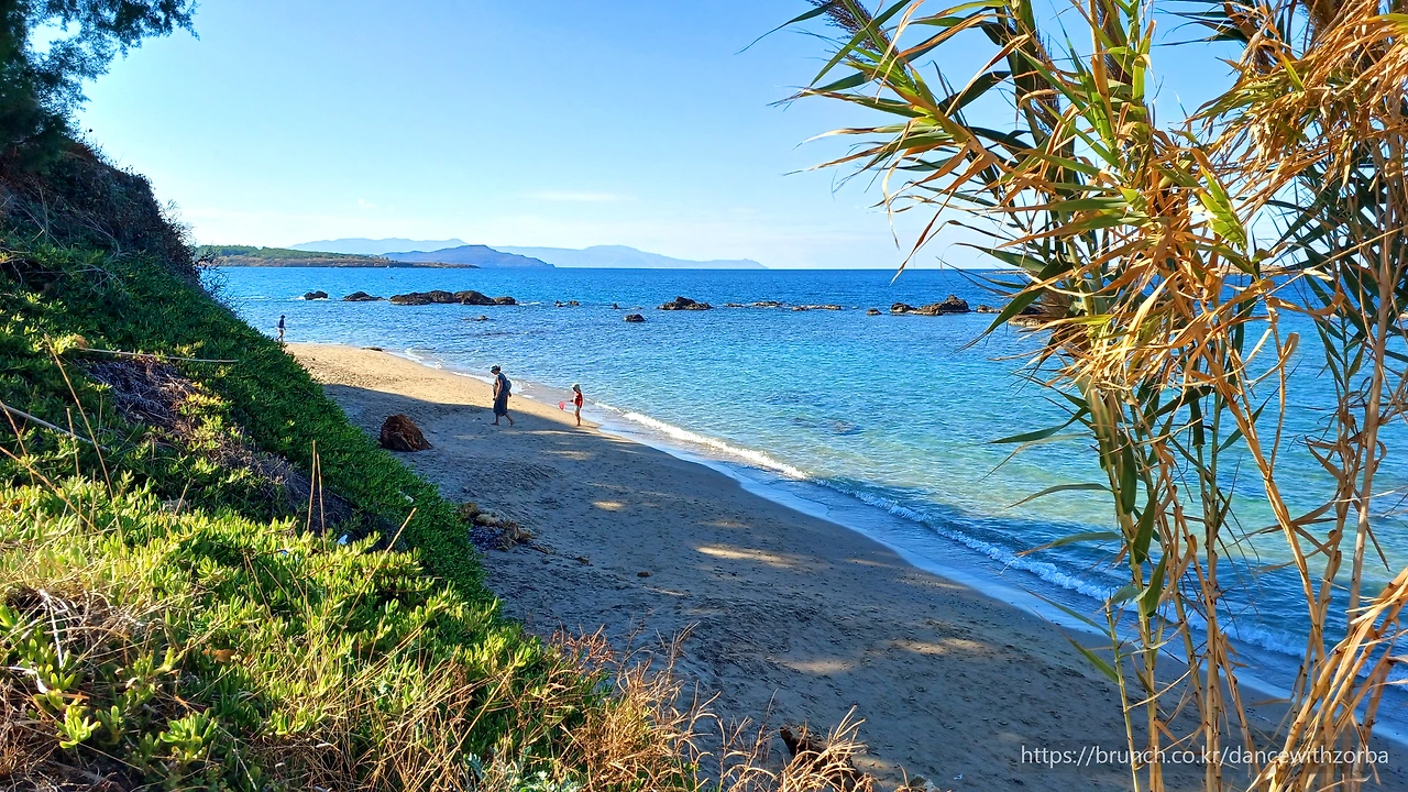 이곳은 화려하지 않다. 모래는 얇고, 해변의 폭도 넉넉하지 않다. 대신 바다는 투명하다. 발목 아래까지 바닥이 훤히 보인다. 흰 벽과 파란 의자, 바닷바람에 흔들리는 차양. 해변을 따라 늘어선 카페와 식당은 전형적인 그리스풍이다. 아직 손님을 부르기 전의 시간이라 테이블들은 가지런히 비어 있고, 그 빈자리에 햇빛이 먼저 앉아 있다. 해변 한쪽에는 오래된 시멘트 풀이 남아 있다. 아이들이 물장구를 치기 딱 좋은 크기다.