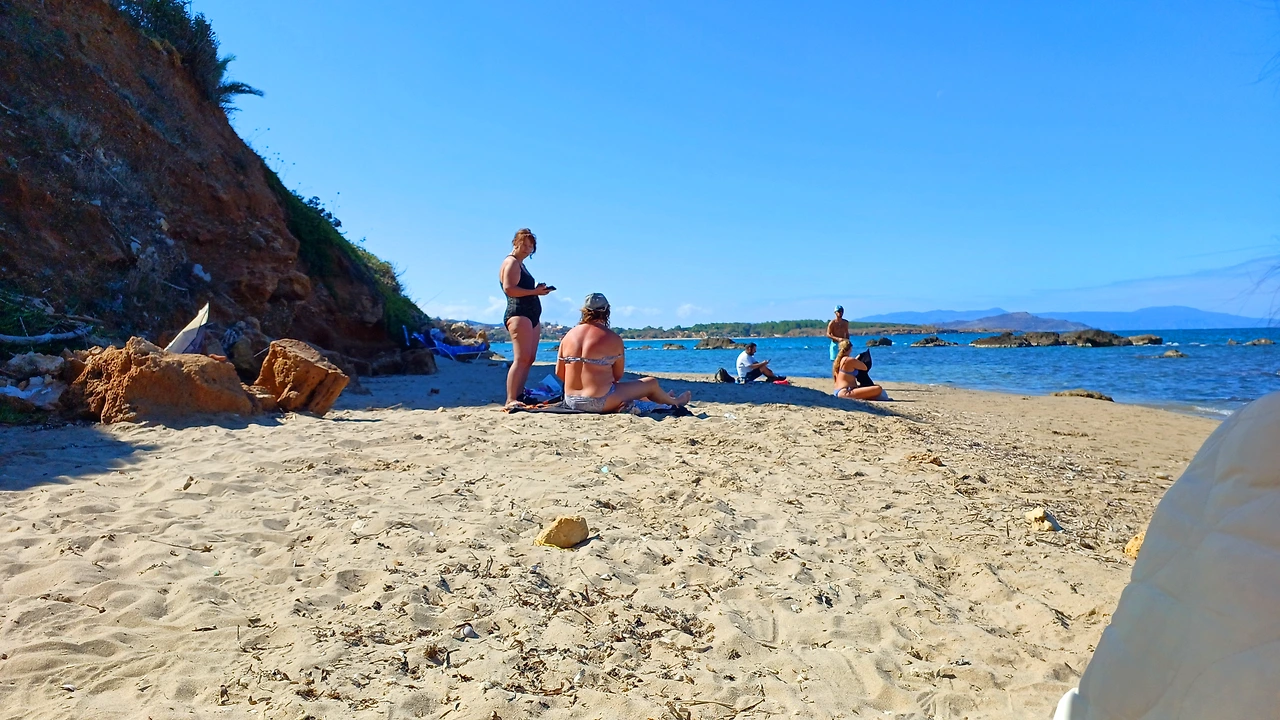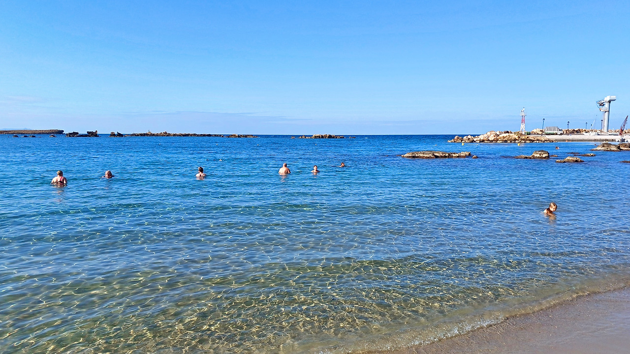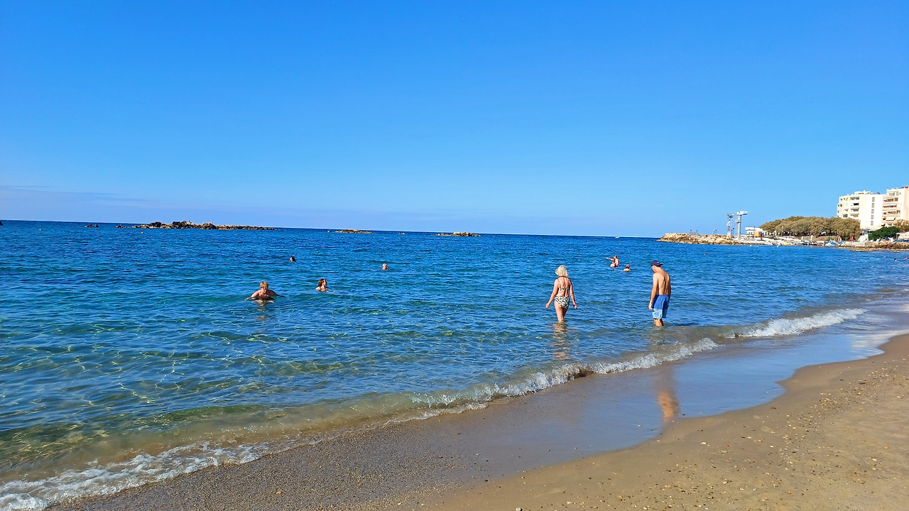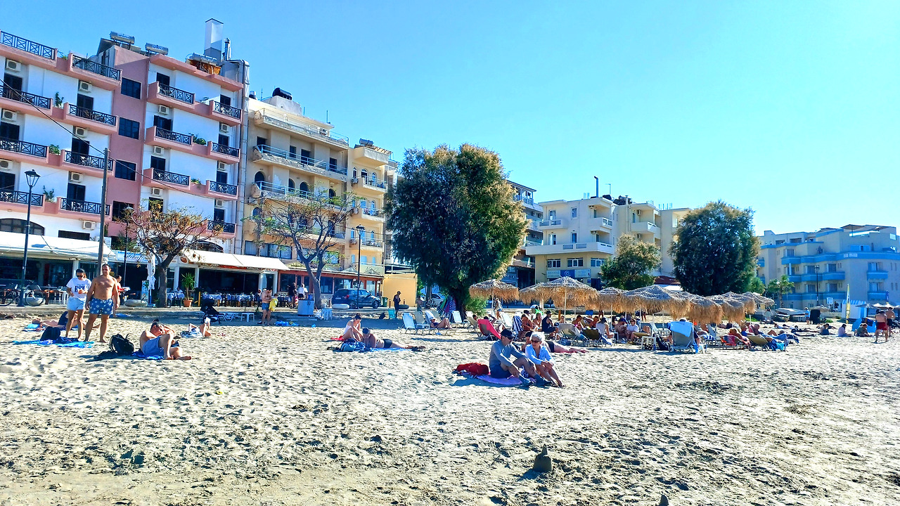 이곳은 화려하지 않다. 모래는 얇고, 해변의 폭도 넉넉하지 않다. 대신 바다는 투명하다. 발목 아래까지 바닥이 훤히 보인다. 흰 벽과 파란 의자, 바닷바람에 흔들리는 차양. 해변을 따라 늘어선 카페와 식당은 전형적인 그리스풍이다. 아직 손님을 부르기 전의 시간이라 테이블들은 가지런히 비어 있고, 그 빈자리에 햇빛이 먼저 앉아 있다. 해변 한쪽에는 오래된 시멘트 풀이 남아 있다. 아이들이 물장구를 치기 딱 좋은 크기다.